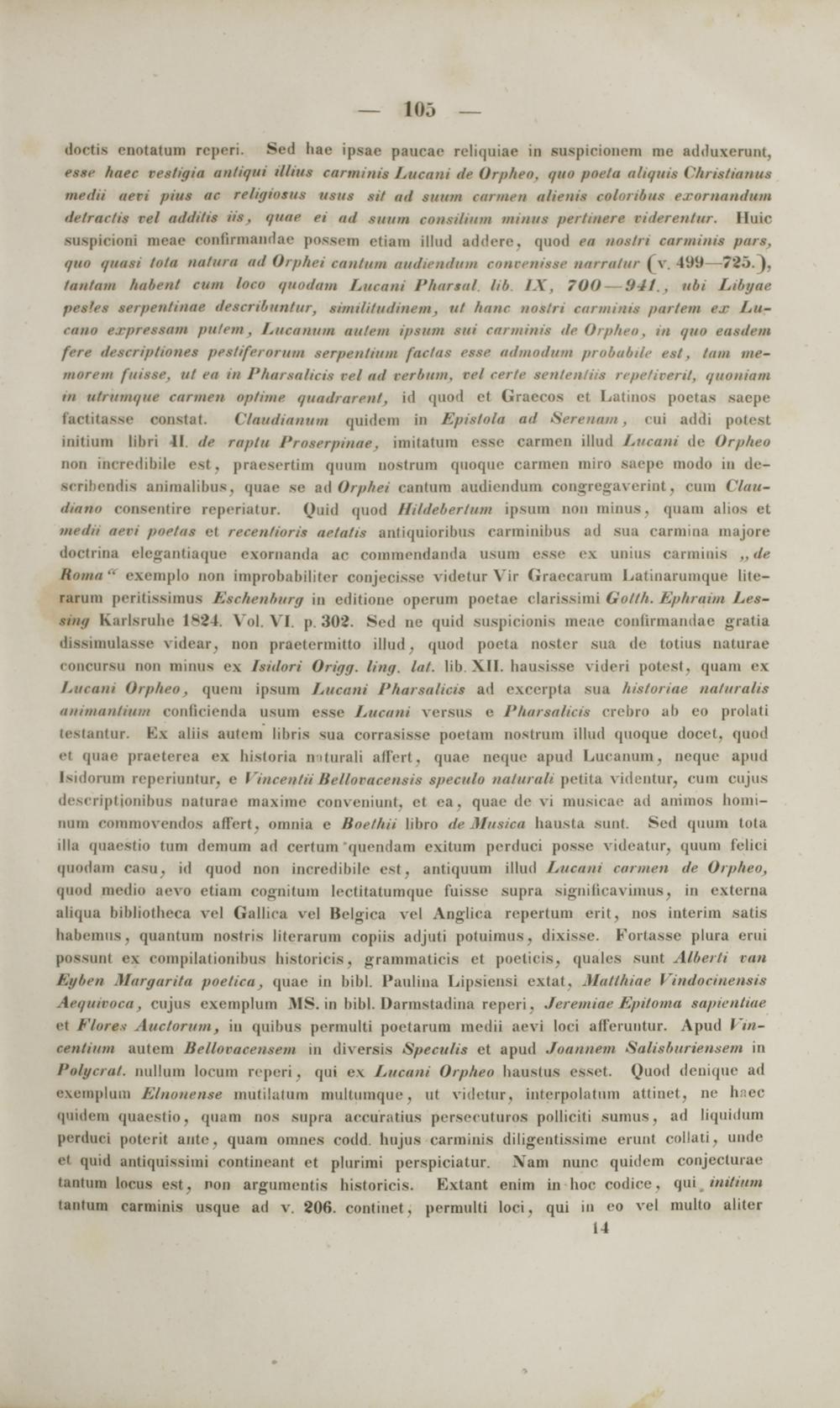 doctis cnotatum rcperi. Sed hae ipsae paucae reliquiae in suspicionem me adduxerunt, esse haec resligia antiqui tllitis carminis l.ucnni de Or/ilieo. quo poeta aliquis C/iristiaiiiis metlii aeri pius ac relujiosus usus sit ad sutim carmen alienis coloribus exornaitditm iletractis rel aililitis iis, quae ei ad suum cousiliiini " iiiiiis pertinere rideren/iir. Huic suspicioni meae conlirniandae possem etiam illud addere. quod ea tioslri carmiitis pars, qtto quasi lo/a tia/itra ad Orpliei cauliim ttitdiendiiin SMMMHM ttarrtitiir ( v. 499 — 725.), laittatii lutbent cunt loco qnodam Lttcani 1 'harsal. lib. IX, 700 — 941., ttbi Ltbgae pes/es serpettlinae describtintiir, similitiidinem, ut lianc nostri carintnis partem ex Lit- cano expressatn ptitetn , Litcanuin aiitem ipsitm stti ctirminis de Orpheo, tti quo easdem fere descripliones pestiferorttm serpenliitiu faclas esse admoditm probttbtle est, tam me- morem fitisse, ut ea in Pharsalicis rel ad rerbitin, rel certe sentenliis repelirertt, qttoiiuun tn utrttmqtte carmen optime qttadrarent, id quod et Graecos et Latinos poctas saepe factitasse constat. Vlaudianttm quidem in Epislola ad Sereiiaiit , cui addi potest initium libri 41. de raptu Proserpinae, imitatum esse carmen illud Lucani de Orpheo non incredibile est, praesertim quum nostrum quoque carmen miro saepe modo in de- scribendis animalibus, quae se aAOrphei cantum audiendum congregaverint, cum Clait- iliftno consentire repcriatur. Qoid quod Hildeberlttm ipsuin non minus. quain alios et medti aeri poetas et recenlioris aetalis antiquioribus curminibus ad sua carmina majore doctrina elegantiaque exornanda ac commcndanda usum esse ex unius carminis „de Homa a exemplo non improbabiliter conjecisse videtur Vir Graecarum Latinarumque lite- rarum peritissimus Eschenhttrg in editione operum poetae clarissimi Golth. Ephratin Les- siiuj Karlsruhe 1824. Vol. VI. p. 302. Sed ne quid suspicionis meae conlirmundae gratia dissiniulasse videar, non praetermitto illud, qtwd poeta noster sua de totius naturae concursu non minus ex Isidori Origg. ling. lat. lib. XII. hausisse videri potest, quam ex l.uctuii Oiplteo, quein ipsum Litcani PhmrtmHcit ad excerpta sua historiae nalnralts oiiiiiiiiii/iuiu conlicienda usum esse Liictini versus e Pltarsttlicis crebro ab eo prolati testantur. Ex aliis autem libris sua corrasisse poetam nostrum illud quoque docet, quod et quae praeterea ex historia n iturali allert. quae neque apud Lucanum, neque apud Isidorum reperiuntur, e Vincenlii Helloracensis specttlo iialttralt petita videntur, cum cujus descriptionibus naturae maxime conveniunt, et ca, quae de vi musicae ad animos homi- MHB commovendos affert , omnia e Hoelhit libro de Mttsica hausta sunt. Sed quum tota illa quaestio tum dcmum ad certum 'qUendun exitum perduci posse videatur, quum felici quodam casu, id quod non incredibile est, antiquum illud Lucant carmen de Otpheo, quod medio aevo etiam oognitum lectitatumque fuisse supra signilicaviinus, in externa aliqua bibliotheca vel Gallica vel Belgica vel Anglica repertum erit, nos interim satis habemus, quantum nostris literarum copiis adjuti potuimus, dixisse. Fortasse plura erui |xissiini ex compilationibus historicis, grammaticis et poeticis, quales sunt Alberti van Effben Margarita poetica, quae in bibl. Pauliua Lipsiensi extat, Matthiae Vindoeinentie Aequivoca, cujus exemplum MS. in bibl. Dannstadina reperi. Jeremiae Epitoma eapientiae et Flores Avctorum, in quibus pemiulti poetarum medii aevi loci afferuntur. Apud Vin- oentiutn autem BeUovaeeneem in diversis Specttlis et apud J .oannem Salisburiensem in Pelycrat. niillum locum reperi, qui ex Liteani Orplteo baustus esset. Quod denique ad exemplum Elnonenee miitilatum multumque, ut videtur, interpolatum attinet, ne h;iec quidem quaestio, quam nos supra accuratius persecuturos polliciti sumus, ad liquidum perduci poterit ante. quam omnes codd. hujus carminis diligentissime erunt collati, unde e( quid antiquissimi contineant et plurimi perspiciatur. Nam nuno quidem conjecturae taatuai locus estj non argumentis historicis. Extant enim in hoc codice, qui initium laniuin oarminis usque ad v. 206. continetj permulti loci, qui in eo vel multo aliter