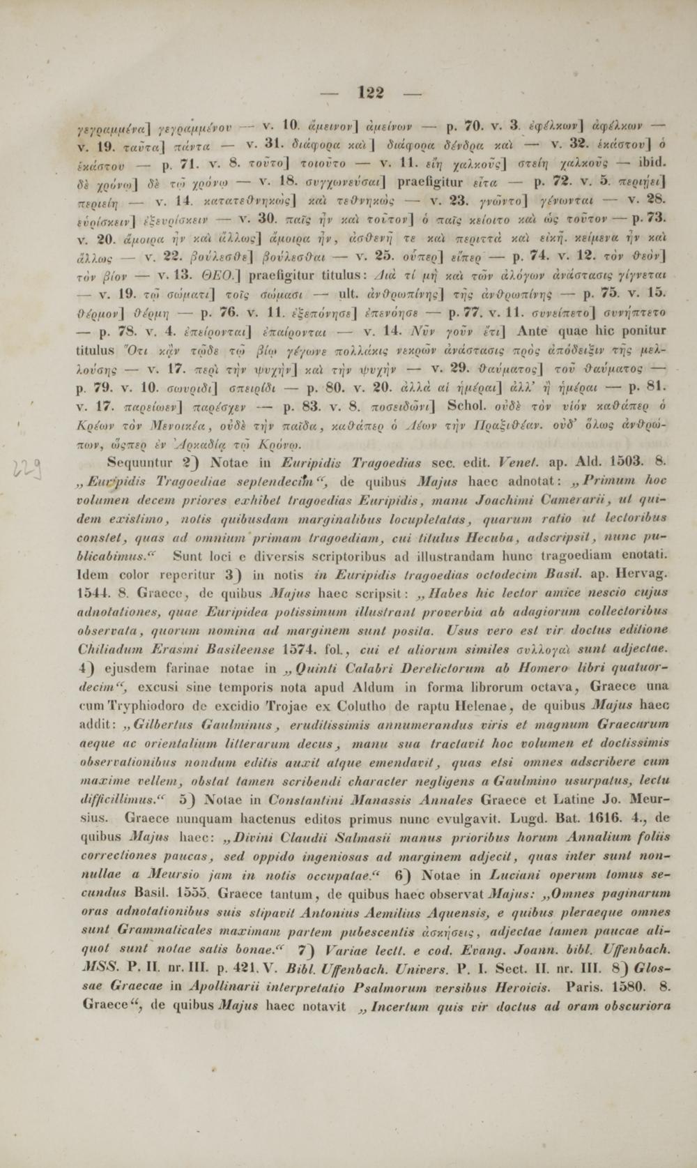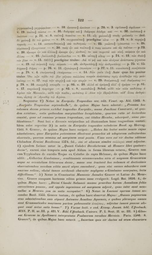 Sequuntur 2} iVotae Iu Euripidis Tragoedims scc. edit. Venel. ap. Ald. 1503. 8. „Euchidis Tragoeditu sep/endecifn", de quibus Majus haec adnotat: „ Primvrm hoc volumen decem priores exhibet tragoedias Euripidis, manu Joachimi Camerarii, ul qui- dem existimo, notis quibusdam marginaltbus locupletatois, quarum ratio ut lectoribua conslel, quas ad omnium primam tragoediam, cui tituiue Htcaba, adscripsit, nunc /m- blicmbimus." Sunt loci e diversis scriptoribus ad illustrandam hunc tragoediam enotati. ldem color repcritur 3) in notis in Euripidis tragoedias octodecim Bustl. ap. Hervag. 1544. 8. Gracce, de quibus Majus haec scripsit: „Habes hic leclor amice nescio tujus adnotatione», quae Euripidea potissimum illutVrant promerbia ah adagiorum collecloribus observala , quorum nomina ad marginem sunt posila. Usus vero esl vir doclut etlilioiie Chiliadum Erasmi Basileenst 1574. fol., cui et aliorum similes av /./.oydi sunt adjectae. 4j ejusdem farinae notae in „Quinli Calabri Dereliclorum ab Homero libri quatuor- decim", excusi sine temporis nota apud Aldum in forma librorum octava, Graece una cumTryphiodoro de excidio Trojae ex Colutho de raptu Helenae, de quibus Majus haec addit: „ Gilberlus Gaulminut, eruditistimis annumerandus rtris et magnum Graecarum Heque nc orietUalium litterarum decus, manu tua tractavit hoc volumen et doctissAmit abservationibut nondum tditit auxit atque emendavit, quat etsi emnes adscribere cum maxime vellem, obstat tamen scribendi character negligens u Gauimino usurpaius, lectu difficiilimut." 5j Nolae in Constantini Manassis Annales Graece et Latine Jo. Meur- sius. Graece nunquam hactenus editos primus nunc evulgavit. Lugd. Bat. 1616. 4., de quibus Majus baec: „Divini Claudii Salmasii maaus priohbus horum Annalium foliis cerreclionet paucas, sed oppido ingeniosas ad mnrginem adjecit, quas inter sunt non- nullae a Meursio jam in notis occupatae." 6) Notae in Luoiani operum tomus se- cundus Basil. 1555. Graece tantum, de quibus h&eb obaervat Majus: „Omnet pmginarum orus udnotationibus suis etipavit An/onius Aemi/ius Aquensis, e quibus pleraeque omnes euni Grammalicalet maximam partem pubescentis danvottg, adjeclae tamen paucae ali- quot tunt nolae satis bonae." 7) Variae lettt. e cod. Evang. Joann. bibl. Uffenbach. MSS. P. II. pr.IIL p. 421. V. Bibl. Uffenbach. Unirers. V. I. Sect. II. nr. III. 8) Glos- sae Graecae in ApoUinarii interpretatio Psalmorum versibus Heroicis. Paris. 1580. 8. Graece", de quibuA Majut haec notavit „ Incertum quis vir doctus ad oram obscuriora