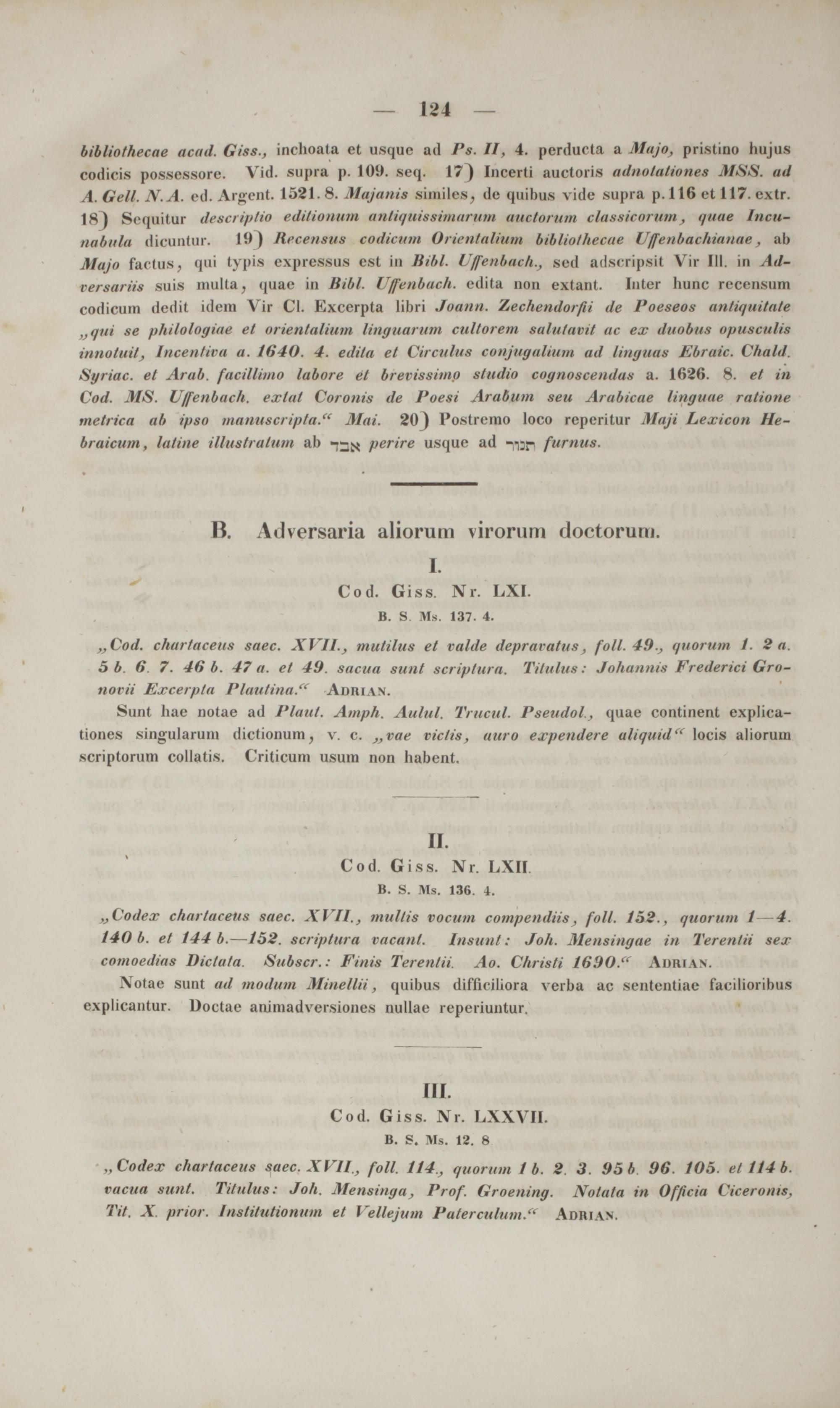 bibliothecae acad. Giss., inchoata et usquc ad Ps. II, 4. perducta a Majo, pristino hujufl codicis possessore. Vid. supra p. 109. seq. 17) Incerti auctoria adnotationes MSS. ail A. Gell. N.A. ed. Argent. 1581. 8. Majani» similes. de quibus vide aupra p. 116 et 117. extr. 18) Sequitur descriptio editionum antiquissimarum auetorum claseicorum, t /nae Ineu- nabula dicuntur. 1!*) Heeeneue eodicum Orientalium bibliothecae Uffenbachianae, ab Majo factus, qui typia expremua est m Bibl. Uffenbach., sed adscripait Vir III. in Ad- verearue suis niulta, quae in Bibl. Ufenbach. edita non extant. Inter hunc recensum codicum dedit idem Vir Cl. Excerpta libri Joann. Zechendorfii de Poeseos antiquitate „qui se philologiae et orientalium linguarum cultorem talutavit ac tx duobue opueeulie innotuitj Incentwa a. 1640. 4. edita et Cireulue cenjugaUum ad Unguete Ebraie. Chald. Syriae. et Arab, faeilUmo labore et brevieeitnp sludio cognoscendas a. 1626. 8. et in Cod. MS. Uffenbach. exlat Coronis de Poesi Arabum seu Arabicae linguae ratione tnetrica ab i/>so manuscripta." Mai. 20) Postremo loco reperitur Maji Lexicon He- braicum, la/iue illuetratum ab «73^ perire usque ad -■ furnus.