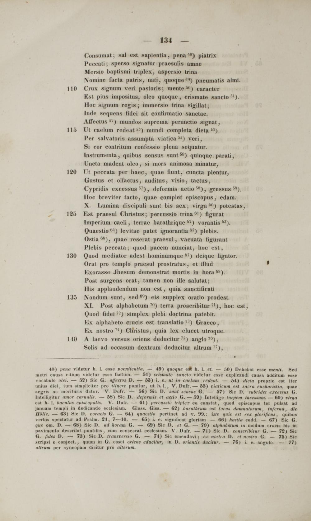 48) pena videtur h. I. esse poenitentia. — 49) quoqne ei# h. 1. et. — 50) Debebat esse menti. Sed metri causa vitium videtur esse factum. — 51) crismnte sancto videtur esse explicandi causa addituin esse rocabulo olei. — 52) Sic G. affectos D. — 53) i. e. ul in ciulum reileat. — 54) dieta proprie est iter uiiiiis diei, tuni simpliciter pro itinere ponitur, ut h. \. } V. Dufr. — 55) viaticum est sacra eucharistia. quae aegris ac morituris datur. V. Dufr. — 56) Sic D. sunt tentlu G. — 57) Sic D. subridel esccssus V. [ntelligitur «wiir carnali*. — 58) Sic D. deformis et actio G. — 59) Intellige turpem incessum. — 60) rirga esl b. I. Imritliis epiteopali*. V. Dufr. — 61) percussio triplex eo constat, quod episcopus ter pulsat ad j.uiuain templi in dedicando ecclesiam. Gloss. Giss. — 62) barathrum cst locus damnatorum, inferna, die Hdlle. — 63) Sic D. voracis G. — 64) quaestio pertinet ad v. 99.: iste quis est rex glorificus , quibus verbis spectatur ad Psalni. 24, 7—10. — 65) i. e. Ngnifioat gloriam — 66) hostia codd. — 67) Sic G. que oin. D. — 68) Sic D. <»</ Iwram G. — 69) Sic D. et G. — 70) atptiuhetum in moduiu crucis bis in pavimento describit pontifex, cum consecrat ecclesiam. V. Dufr. — 71) Sie D. conscribitur G. — 72) Sic fi. fides D. — 73) Sic D. transversio G. — 74) Sic. emendavi; ex nostra D. et nostro G. — 75) Sir icripsi e conject., quum in G. esset oriens educitur, in D. orientis ducitur. — 76) i. e. angulo — 77) altrum per syncopam dicitur pro alterum.