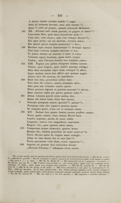 A dextro versus orientis mobile ?x ) anglo Solis ad occasum laevum; crux inde notatur""). Quae s ") redit ad gentes, quando retrocedit Hebraeus. 145 XII. Advocat inde deum praesul. ut pugnot in armis sl ) Conversus fidei; post haec benedicitur unda v -') Cum sale, cum Btnere < cum vino cumque Baento* 3 ) Est aqua plebs; sal est doctrina. scientia dulcis; Est cineris pulvis humilis memoratio M ) finis; 150 Bacchus aqua mixt us hominemque w ) deumque figurut. Post haec ecclesia lympliis lustratur et ara . Ut jnatna doniiM sit sanctus et batus e< cxira Virtutem signat humilem, quam mittit ysopus Undam . luiin ClmMus humilis nos compluit ymbrc. 155 XIII. Tegitur ara quibus dcsignant linthea carnem Christi. quae fragrat, quae candet quaeque refulget. Hine tlllU accensum super aram corniger 8U ) affert, Inquc modum crucis hoc affert; per quatuor anglos Altaris facit ille crucem; de sanctificato 160 Dlinit hos oleo, procedens ordine muri.