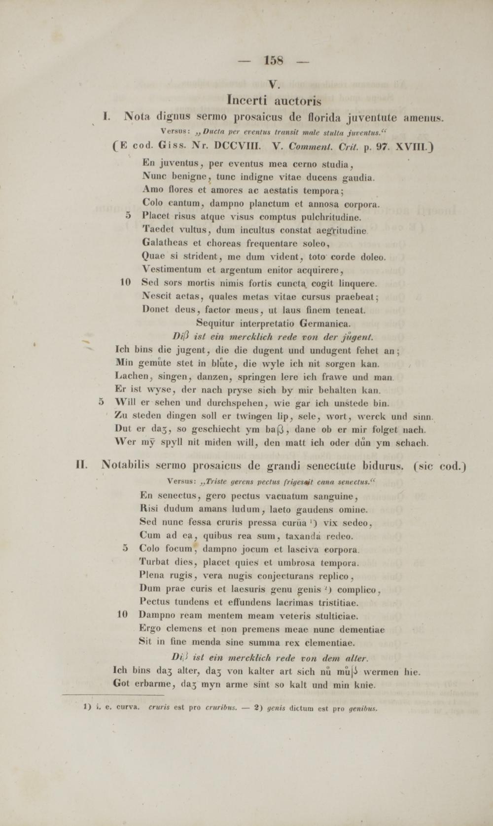 Versus: ,,Triste gerens pertus frit/esmt cana settectus." En senectus, gero pectus vacuatum sanguine, ftisi dudum amans ludum, laeto gaudens omine. Sed nunc fessa cruris pressa curiia') vix sedeo. Cum ad ea, quibus rea sum, taxandu redeo. 5 Colo focum, dampno jocum et lasciva eorpora. Turbat dies, placet quies ct unibrosa tempora. Plena rugis, vera nugis conje('lurans rcplico . Dum prae curis et laesuris genu genis ') complico . 1 'ectus tundcns et effundens lacrimas tristitiae. 10 Dampno rcam mentem meam veteris stulticiae.