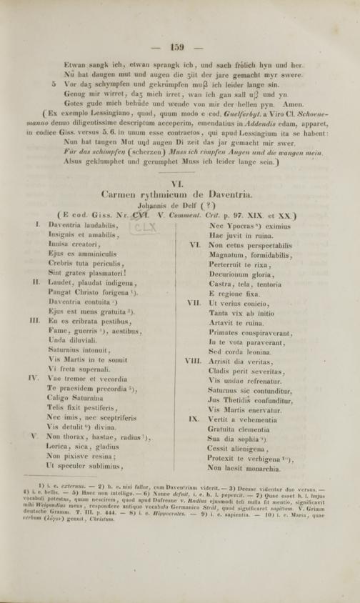 1) i. e. exteruus. — 2) h. e. nisi fallor, cnm DavenUiam viderit. — 3) Deesse videntur dtio vcrsiis.— 4) i. e. bellis. — 5) Haec non intelligo. — 6) Xonne defuit, i. e. h. 1. pepercil. — 7) Quae esset h. I. bajnt vucnbuli putestas, quuiii nescirem, quod apud Dufresne v. JImWki ejusmudi teli ntdla lit nientio, significavit mihi WMfndlni meus , respondere anliquo vocabulo Germanico Strtil, quod tighincarei tafittnm. V. Grunm deutsche (iramm. T. iii. p. 444. — 8) i. e. Ilivviicrtites. — 9) i. e. sapienlia. — 10) i. e. Maria, qnae rerbum (koyoi ) geniul . Ck l i t tt m.