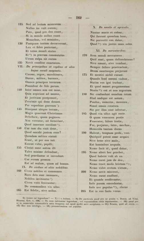 Quod occidit justum reus? Quondam milites statuti Erant, ut per eos tuti Essent vidui, pupilli; 155 Clerici nunc autem illi Tales minime defendunt, Sed praedantur et incendunt. Cor eorum pronum Est ad malum, quam ad bonum. IX. De civibus et atiis nobilibus. 160 Cives nobiles et communes Raro dolo sunt immuues, Nobiles invitiantur ") Cives vero fenerantur; De communibus vix ullus 165 Est fidelis, sive nullus.