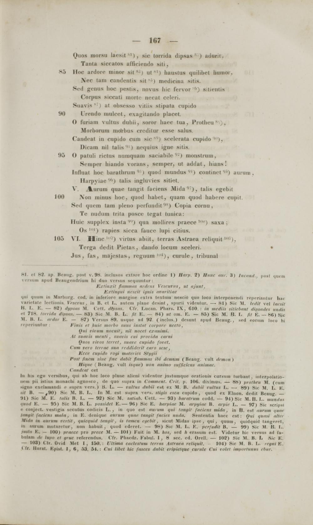 sigiio rxelaiiiantli o supra vers.) B. L. — rultns riiihii est px M. B. riiibii rultiis L. —. 89) Sie M. L. K. sit B. —,90) Sm M. B. L. In M. est supra vers. stigis escn cupido, quod e.x Klnon. dedit Beaug. — 91) Sic M. K. tnlis B. L. — 92) Sic M. sntinb. Cett. — 93) biirntriim codd. — 94) Sic M. B. L. MM4MI .(»»(/ K. — 95) Sic M. B. L. possiriel K. — 96) Sic K. hnrpiue M. nrpgiite B. nrpie L. — 97) Sic scripsi e conject. vestigia sccutus codicis L. , in quo est NM qui tangit fnriens mirin , in B. est MM i /une imiiiit fnriens miiln , iu K. denique nuruin qune. tnngit fneies nurin. Sententia haec cst: (Jui qunsi nttei Mitin in HrM n ilil. qttirqnid tnngit , is tnmen egebit , sicut Mitlas ipse , qui , qiiuin, qiiidqnitl langeret, 111 aiiriun niutaretur, 11011 liabuit , quod ederet. —■ 98) Sic M. L. K. perfttdit B. — 99) Sic M. B. L iiistn K. — 100) prnere pro prere M. — 101) Kuit in M. hos, sed h erasiuu est. Videtur hir versus ad fa- liulani rie lupo et grue referendus. Cfr. Phaedr. Kabul. 1, 8 aec. ed. Orell. — 102) Sic M. B. L tUc K. — 103) Clr. Ovid Met I, 150.: Vltima cnelestum terrus Astrnen reliquit. 104) Sic M. B. L. regui K. I tr. Horal. Kpist. 1,6, 53. 54.: Cni libet ktc fasces rinbit eripietque curule Cui rolet impnrtuniis elmr.