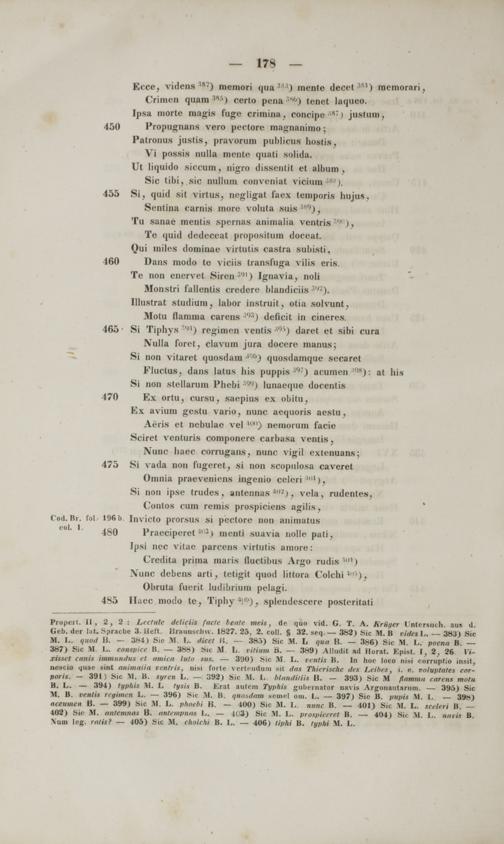 Propert, II, 2, 2 : Leclule deliciis facte beate nieis , dc quo vid. G. T. A. Kriiaer IXatenuch. aus d. Gcb. der la*. Sprache 3. Ueft. Bnumcbw. 1627. 25, 2. coll. § 32. seq.— 382) Sic M. B rides L. — 383) Sic M. Lu quod U. — 384) Sic M. L. dicet B. — 385) Sic M. L qua B. — 386) Sic M. L. poena B. — 387) Sic M L. conspice B. — 388) Sic M. L vitimn B. — 389) Alludit ad Horat. F.pist. \, 2, 26 Vi- xisst t auiis immuiidus el amica luto sus. — 390) Sic M. L. ventii B. ln hoc loco nisi corruptio iniit, nt sno quac sint tmimaiia tentris, nisi forte vcrtendum sit das Thierische des Leibes y i. e. voluptates cor- poris. — 391) Sic M. B. syren L. — 392) Sic M. L blmuliiiis B. — 393) Sic M flamma caretu motn B. L. — 394) typhis M. L tysis B. Erat autcm Typhis gtibcinator navis Argonautarum. — 395) Sic M. B. rentis remmen L. — 396) Si« M. B. qnosdam seinel oin. L. — 397) Sie B. pupis W. L — 398) accuiuen B. — 399) Sic M. L. plioebi K. — 400) Sic M. L. nunc B. — 401) Sic M. L. iceltri B. — 402) Sic M. antemnas B. untempntu L, — 403) Sic M. L. prospiceret B. — ■ 404) Sic M. L. nacis B. \uni \cg. ratis? — 405) Sic M. cholchi B. L. — 406) liphi B. typhi M. L.
