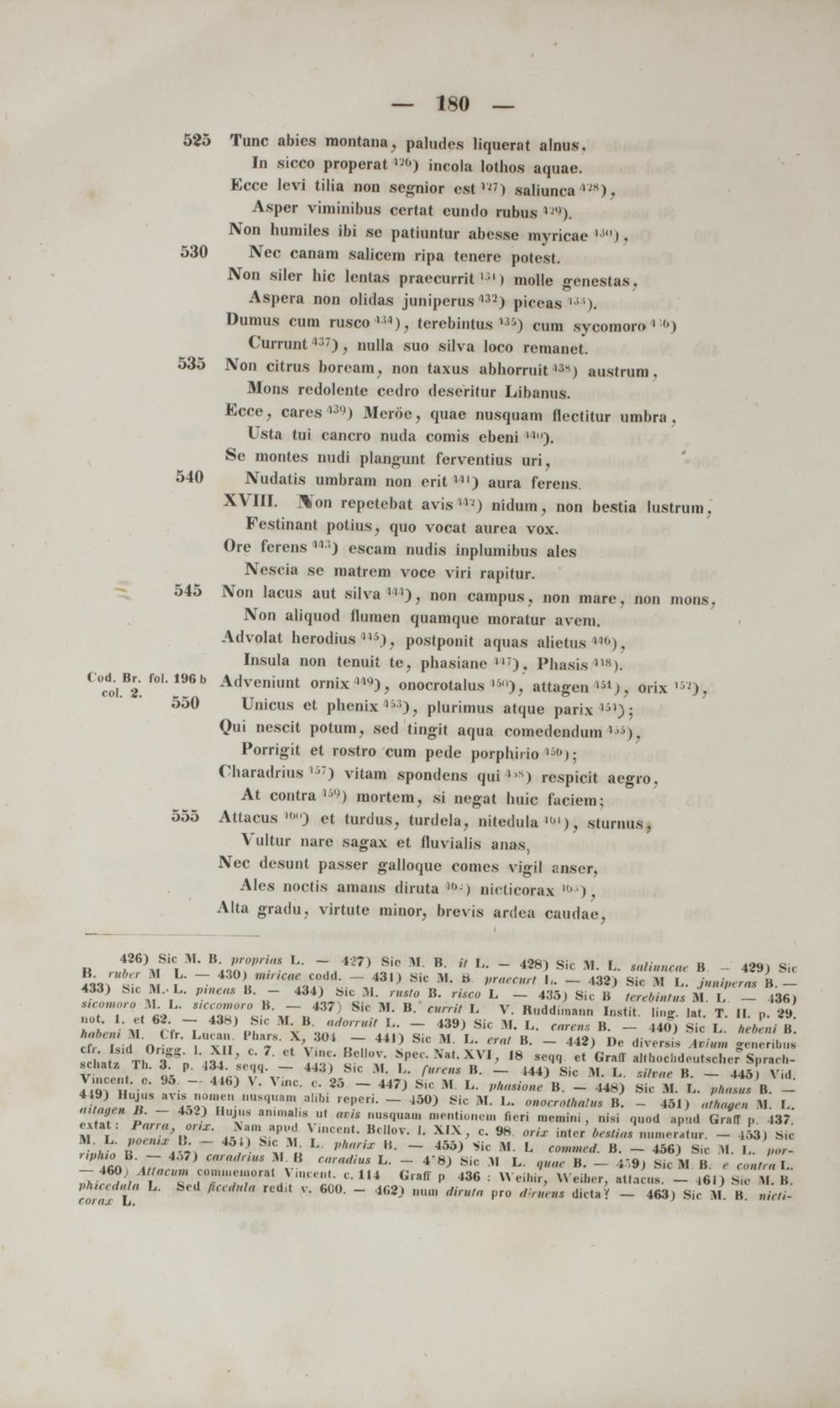 Festinant potius, quo vocat aurea vox. Ore ferens M3 ) escam nudis inplumibus ales Nescia se matrem voce viri rapitur. 545 Non lacus aut silva 111 ), non campus, non mare, non mons, Non aliquod flumen quamque moratur avem. Advolat herodiiu '**) , postponit aquas alietus ,1(l ), Insula non tenuit te, phasiane W7 ). Phasis m ). fod. Br. fol. 196 b Adveniunt ornix 11 ' 4 ), onocrotalus ,5 "), attagen 131 ), orix 'l. 550 Unicus et phenix 133 ), plurimus atque parix ,31 ); Qui nescit potum, sed tingit aqua comedendum 1 ").