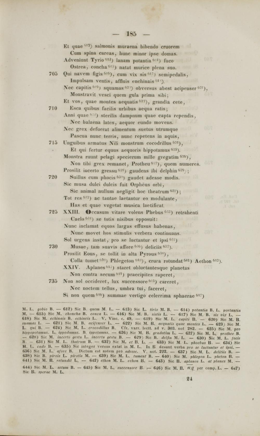 M. I.. gobio B. — 612) Sic B. qtiem M I.. — 613) Sic L. tirio M. B. — 614) potantia B. L. portantia M. — 615) Sic M. choncha B. conca L. — 616) Sic M. B. sistis L. — 617) Sic M. B. sis vix L. — 618) Sic M. echinais B. echineis L. V. Vinc. c. 49. — 619) Sic M. L. capiti B. — 620) Sic M. B. sumnas L — 621) Sic M. B. acifenser l,. — 622) Sic M. B. aequatis quae tnontes L. — 623) Sic M. L qui B. — 624) Sic M. L. crocodillus B. Cfr. varr. lectt. ad v. 303. not 282. — 625) Sic M. pro UppopotamuM. L. ippodamus. B. ippotanms. — 626) Sie M. B. gradatim L. — 627) Sic M. L. prothee B. — 628) Sic M. incerto gettu L. incerlu gestu B. — 629) Sic B. delfin M. L. — 630) Sic M. L. focis B. - 631) Sic M. L. thatrum B. — 632) Sic M. et B. L. — 633) Sic M L. phoebus B. — 634) Sic M. I,. cado B. — 635) Sic inleger versns extat in M. L. In li desunt verba pro se luctantur et ipsi. — 636) Sic M. L. afore B. Dictum est aulem pr6 adnsse. V. not. 222. — 637) Sic M. L. delitiis B. — 638) Sic B. pirois L. pirotis M. — 639) Sic M. L. tument B. — 640) Sic M. phtegon L. pheton B. — 641) Sic M. B. retundit L. — 642) ethon M. L. eehon B. — 643) Sic B. aplanos L. at planes M. —