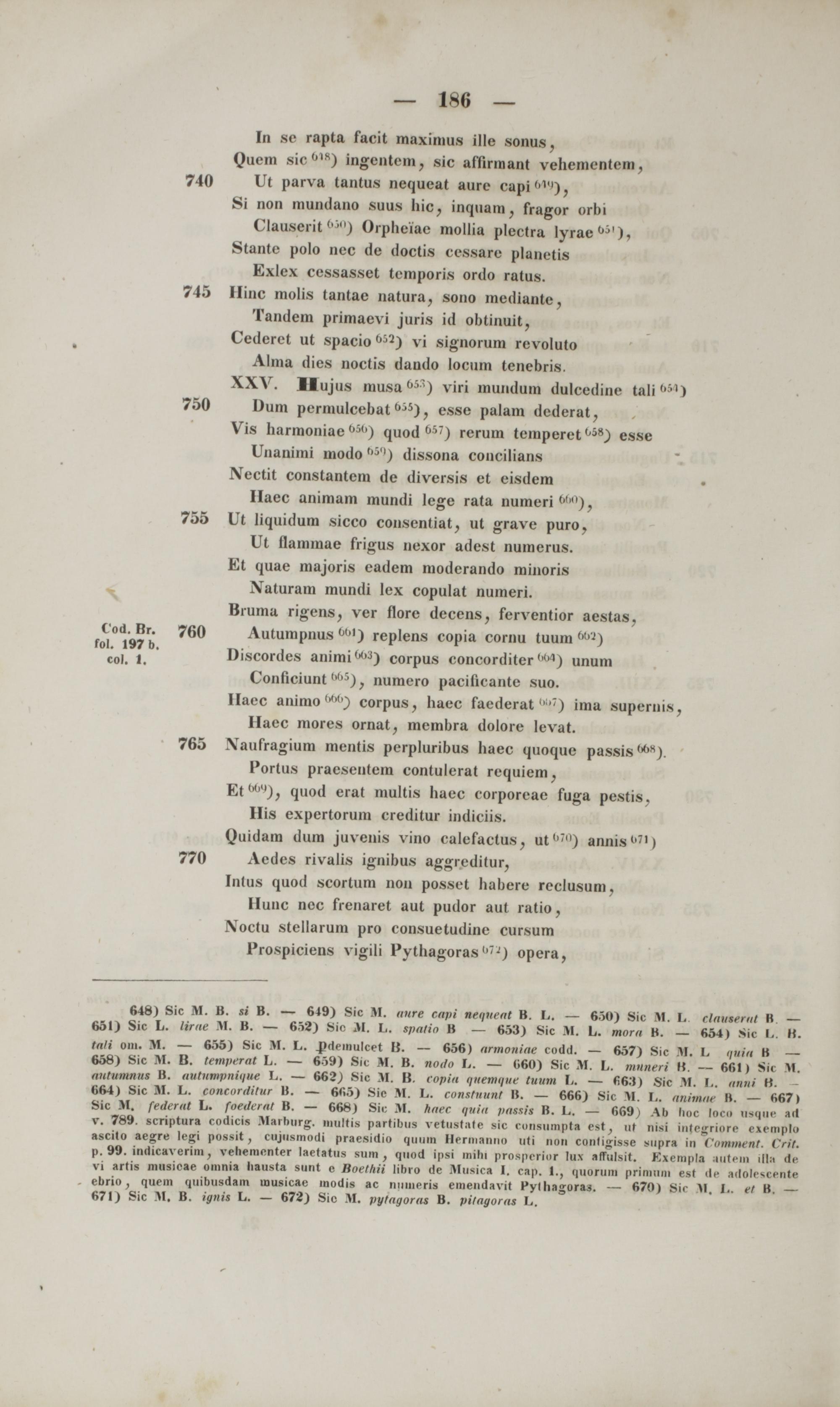 648) Sic M. B. si B. — 649) Sic M. tture capi netiueat B. L. — 6ol>) Sic M. I. ctauserut B — 651) Sic L. Urae M. B. — 652) Sio M. L. tpatio B — 653) Sic M. L. morti B. — 654) Sic I.. B. tnli om. M. — 655) Sic M. L. JJdemulcet B. — 656) armoniae codd. — 657) Sic M. L tfuia B — 658) Sic M. B. temperat L. — 659) Sic M. B. ntulo L. — 1160) Sic M. 1,. muneri H. — 661) Si< M. itiiluntniis B. titiluvipnitiue L, — 662) Sic M. B. Copia gttemque tititni L. — 663) Sic M. L. nnni B. 664) Sic M. L. concordilitr B. — 665) Sic M. L. constuunt K. — 666) Sic M. L. nuinnit B. — 667) Sic M. federal L. faederal B. — 668) Sic M. haec truia inis^is B. L. — 669) Ab hoc loc» usque »d v. 789. scriptura codicis Marbtirg. muKis partibus vetustate sic consumpta est, ut nisi in(egriore exemplo ascito aegre legi possit, cujusmodi praesidio qumn Bermanno uti non conligisse supra in Comment. Crit. p. 99. indicaverim, vebementer laetatus sum, quod ipsi inihi prospcrior lux iffulsit, ExempU lutem illa de vi artis nmsieae oinnia liausta sunt c Boelhii libio de Musica I. cap. 1., quorum primnm est de adolescente ebrio, quem quibusdam musicae modis ac nnmeris emendavit Pythagoraj. — 670) iSir M, L. et B. — 671) Sic M, B. ignis L. — 672) Sic M. pytagoras B. pitagoras L.