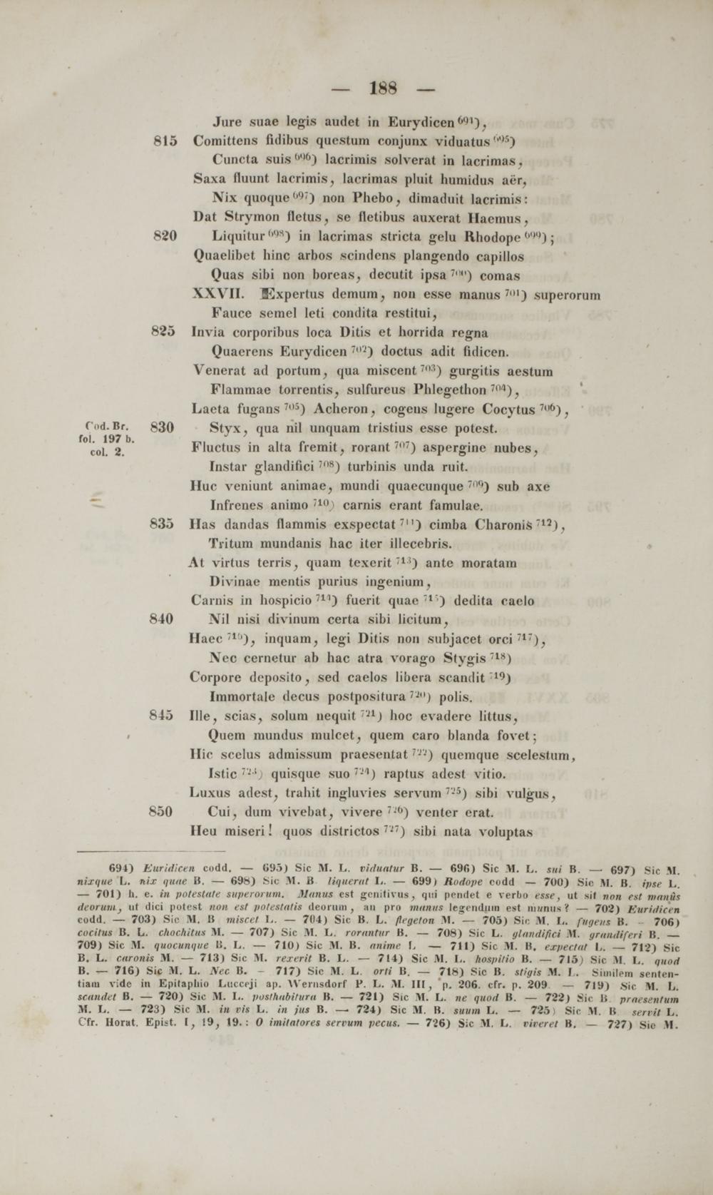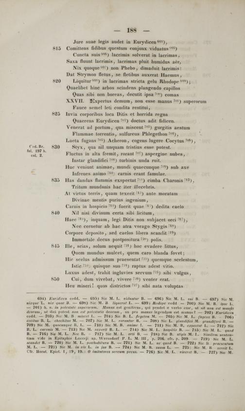 694) Euridietn codd. — 095) Sic M. L. viduatur B. — 690) Sic M. L. sui B. — 097) Sic M. nisque L. nir quae B. — 698) Sic M. B liquerat I.. — 699) Roriope codd — 700) Sic M. B. i/ise L. — 70!) h. e. in potestate tuperorum. Mnniis cst gcnitivus, f|iii pendet e verljo esse, ut sil non est mmtus deoruvi, ut dici potest non ett potettatit deorum , ib pro manus legenduin est tUMnus ? — 702) tSuridicen codd. — 703) Sic M. B miteel I.. — 7U4) Sic B. L. flegeton M. — 705) Sic M. I,. fugeni B. 7061 eoeitut B. L. chachitut M. — 707) Sic M. L. rortmtur B. — 708) Sic L. gtanriifici M. grantHferi B. — 709) Sic M. quocunque B. L. — 710) Sic M. B. anime I. — 711) Sic M. B. espectal I,. — 712) Sic B. L. enroiiis M. — 713) Sic M. rexerit B. L. — 714) Sic M. I.. h—pitio B. — 715 ' Sic M. L. quori B. — 716) Sic M. L. Nec B. - 717) Sic M. L orti It. — 718) Sic B. stigis M. I . Snnil .-in senten- tiam vidc in Epilapliio Lucceji ap. Wernsdorf Y. L. M. III, p. 206. cfr. p. 209 — 719) Sic M. li. scuiulet B. — 720) Sic M. L. potlkabitura B. — 721) Sic M. L. ne quod B. — 722) Sic B praetentum M. L. — 723) Sic M. in vis L. in jus B. — 724) Sic M. B. suum L. — 725) Sic M. It serrit I.. Cfr. Horat. Epi;t. I, 19, 19.: 0 imitatores sereum pecus. — 726) Sic M. L. rireret B. — 727) Si.- M.