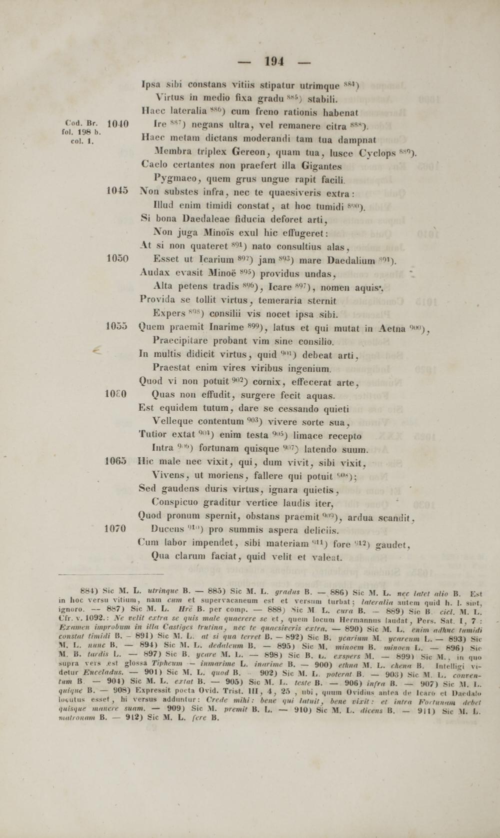 884) Sic M. L. ulrinquc B. — 885) Sic M. L. grailits B. — 886) Sic M. L. ncr lafet nlio B. Est in lioc versu vitium, naui cutn et supervacaneum eit et vernim turbat : Interalin autem quid h. I. aint, ignoro. — 887) Sic M. L. Hrc B. pcr comp. — 888; Sic M L. eura B. — 8*9) Sii; H eiel. M. I.. Cfr. \. 1092.: Ne vclit extra se quit male quaerere se et, quem locum Hermannus laudat , Pera. Sat. 1,7: Hxamett improbum itt Ula Castiget trtttiita, nee te tjuaeshteris cxtra. — 890) sic M. L. tuim nMmt tumitii constat timiiti B. - 891) Sic M. L. at si qua tertet B. — 892) Sic. B. i/carium M. ucareum I,. — 893) Sic M. I,. niinc B. — 894) Sir M. L. dedaletim B. — 895) Sie M. minoem B. minncn L. — 896) Sn M. B. tardis I.. — 897) Sic B. ycarc M. I,. — 898) Sic B. l .. e.rsncrs M. — 899) Sic M. . in quo supra vern esl glossa Tipkeum — inmarime L. inarimt B. — 900) ethna M. I.. chcna B. intelligi vi- delur EUeeladut. — 901) Sic M. L. quod B. 90») Sie M. L. /loterat B. — 908) Sic M. L. convtn- tnm B — 904) Sic M. L. extat B. — 905) Sic M. I,. teste II. — 906) infra H. — 907) Sic M. I.. qutque B. — 908) Expreaait pocta Ovid. Trist. III, 4, 25 , ubi, qirum Ovidms antM de lce.ro el Dnedalu Lo^utus esset , hi versus adduntur: Credt mihi: hcnc qui latuit, bene rixit: et intrn Wortunnm debet quiiqut mnUert sunm. — 909) Sic M. premit B. L. — 910) Sic M, L. iticcns II. — 9il) Sie M. L. matronam B. — 912) Sic M. L. fcre B.