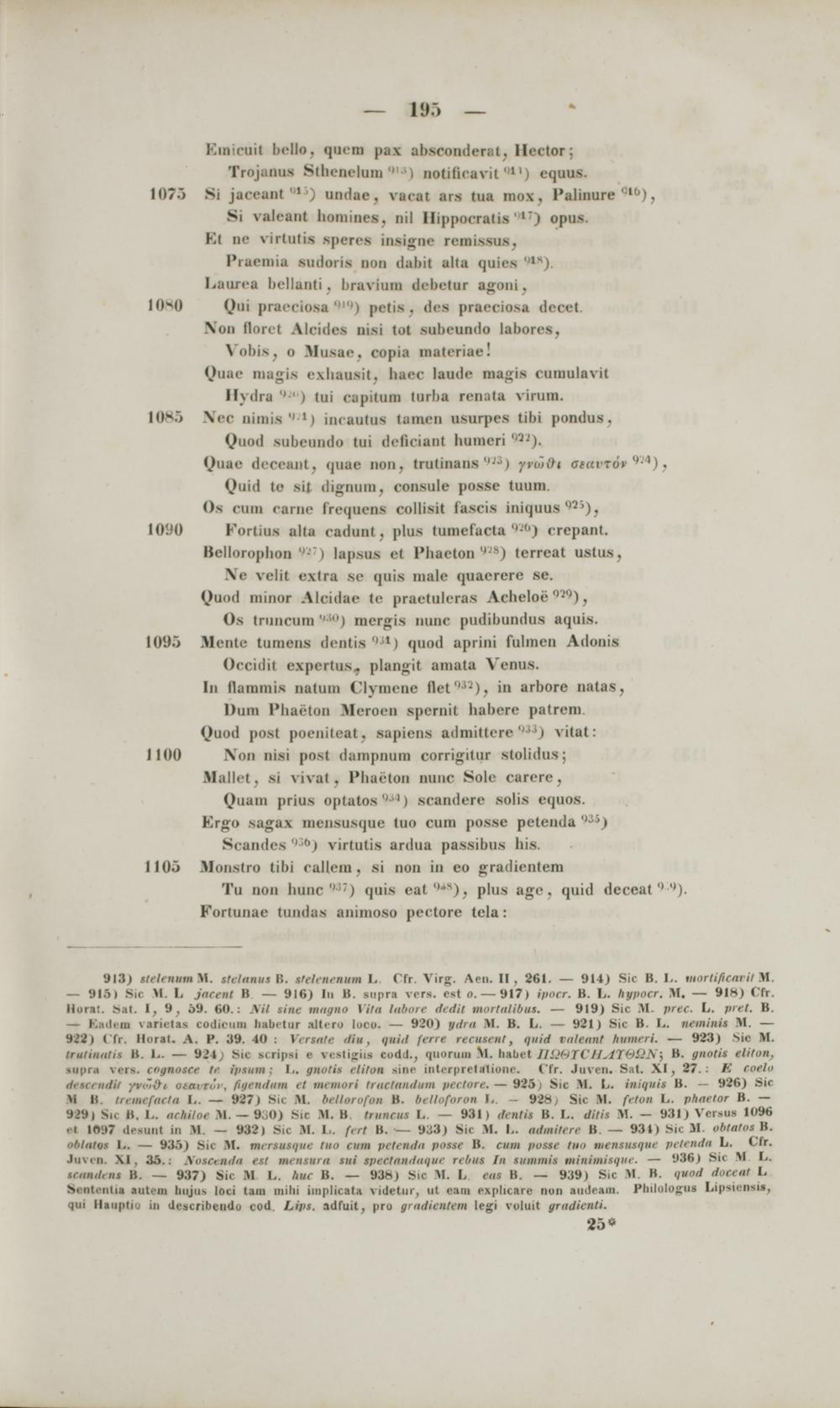 — Kadem varietas codicinu babitur :ilteru loco. — 920) ydra M. B. L. — 921) Sic B. L. neminis M. — 922) Ifr. llural. A. P. 39. 40 : Versate diu, quid ferre recusent, quid viilennt humeri. — 923) Sic M. Irutiuutis B. L. — 924; Sic scripsi e vestigiis codit., qiioriiui M. babet IIi}t-)TC IHT&S2N \ B. gnotis elilon, supra vers. cognosce te ipsum ; L. gnotis eliton sine intcrpretatione. ("fr. Juven. Sat. XI, 27.: K coelo 0M i ndil yvoi&t oiavrur, figendum et memori trnctaiiiliim pectore. — 925 ) Sic M. L. iniquis B. — 926) Sic >l H. Iremcfacla L. — 927) Sic M. hellorofon B. belloforon I. - 928,i Sic M. feton L. phaetor B. — 929) Sic IS. L. achiloe M. — 9o0) Sic M. B. truncus L. — 931) denlis B. L. dilis M. — 931) Vcrsus 1096 ct 1097 desunt in M. — 932) Sic M. L. ferl B. — 933) Sic M. I.. admitere B. — 934) Sic M. obtalos B. nlilatos L. — 935) Sic M. mersusque (M cum petenda posse B. cum posse luo mensusque petenda L. Cfr. Juvcn. XI, 35.: \oscenda est mensura sui spectandaque rebus In sunnnis minimisque. — 936) Sic M L. BawbM B. — 937) Sic M. L. huc B. — 938) Sic M. L eas B. — 939) Sic M. B. quod doceal L Sentcnlia autcui liujus loci tam milii implicata videtur, ut cam explicare non audeam. Pliilulojfus Lipsiensis, qui Hauptiu in dcscribendu cod Livs. adfuit, pro grudientem legi voluit grndienti.