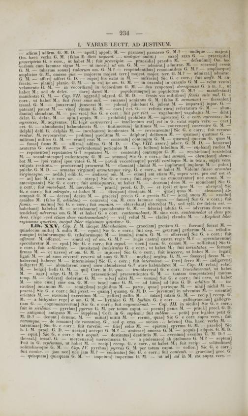 — affirm.] adfirm. (i. M. I). — apoll.J appoll. M. — parnaso] parnasso G. M.? — nndique ... majest] Om. haec verba G. M. (falso E. dicit imprnd. ... undique omitti.) — sa.\o| saxa G. — praecipitiaj praecipicia G. e corr., ut habet M .j fuit jrraecipia. — praesidia] prncdia M. — defendunt] Om. hoc verbum cum lacunae signo M. — ut inccrtl ut om. (J. M. — admir.it. | admirac. M. — recessitl cessit (i. M. — tubarum sonus] lubarum om. (>. M .1 — respondentibns] resonantibus G. M.f ampfiorque] amplicior (i. M., omisso que. — majorem majest terrj majest. maior. terr. G. M.? — admirat.] admirac. G. M. — affertj adfeii (i. I». — rupis] bis extat in M. anfractn] Sic (i. c corr.: fuit amfr. M. an- fracto. — planit] planic (i. M. — in ea] in om. (i. M. ■— in oracnla] in oraculo G. M. — velnt vento] velamento (i. M. — in vecordiam] in vecordium (i. M. — deo rcsponsa] deresponsa (i. a m. 1., ut habet M.; scd de dclet. — darej darct M. — populornmque] ac populorum (i. M.? — manifestant] manifcstat G. M. — Cap. VII. aggred.l adgred. (i. M. I). — fessis via militibusj fessis suis mil. <•• e corr., ut habet M.; fnit fessi staa mtl. — emanus] aenianus (i. M. (falso E. aemanus.) — thessalor.J tessal. G. M. — junxerantj jnnxerat M. — jubentj jubebant G. jnbeat M. — imparati] inpar. G. — pateanfj pateat M — vino| vintim (i. M. — caet.J cet. (i. — rcfcrta ruraj refertatnra (i. M. — abun- dantia| abundanc. M. — pro vict.| Sic (i. e corr.; fmt per vict. — vagabanturj vagabatur M. — dilat.J delat G. delac. M. — opin.J oppin. M. — prohibiti] prohibitc M.— agrestes] (i. e corr. agrenses; fuit agrences, M. acgrentcs. (E. legit acgrences.) — intellectum estj esi in (i. extat snpra vers. - caet.] cet G. — abundantia] habundancia M. — GnitimoTum] finitimos M. — convenerej convenire (i. M. — delphi| «lclti (i. dclphis M. — incubantesj incubentes M. — revocarenturl Sic (i. c corr.; liiit revora- rr /itur. M. revocaretur. — peditum] paeditum M. — dclphor.J dclforum M. — quatuor] quattuor (i. — militumj milites G. M. — erant| erat M. — contemtuj contemptn G. M. — quarumj quorum (i. qtios M.