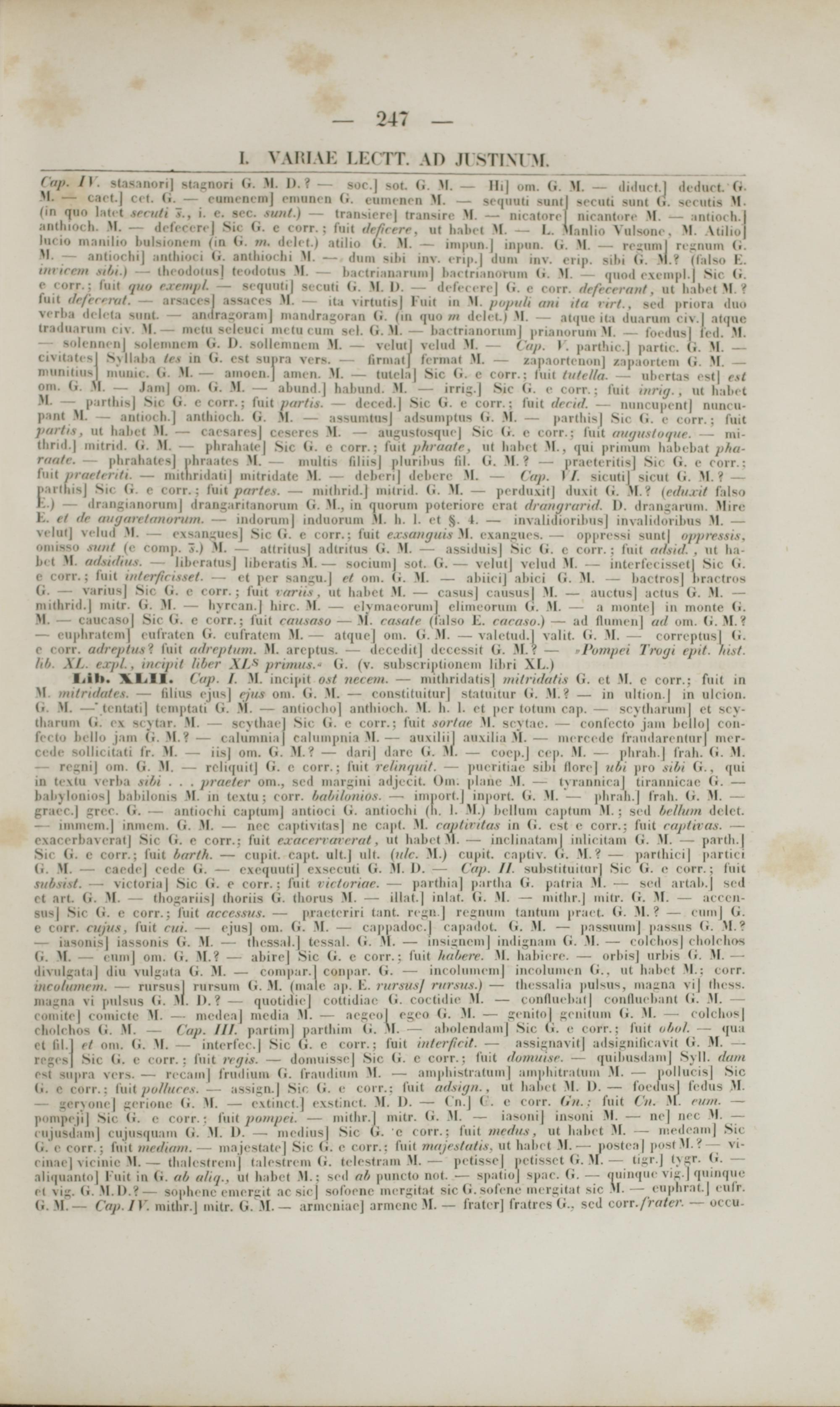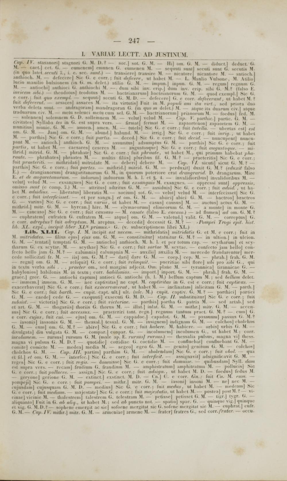 soli nni ii| solcmiii in (i. I). sollenincm M. — vclutj velud M. Cap. I. parthic.] partie. (i. M. — riMtatisj Sxllaha le.s in (i. rst siipra vers. — firmatj fermat M. — zanaortcuon] zapaortem G. M. — niunitiusj miiiiie. (i. M. — amocn.j anicn. M. — tutela| Sic (i. c corr.; luit tutella. — ubcrtas cst| est om. (i. M. — I ii»; om. (i. M. — abund.| hahunil. M. — irri^.| Sic (i. e corr.; fuit mrttj. , ut h il .i t M. — parthis] Sic G. e corr.; fuit /xirtis. — dcced.| Sic G. e corr.; Ml tlrritl. — iiiinriipcnt| ntincii- pant M. — antiorh.] anthiocb. (i. M. — assumtus] adsuinptus (i. M. — par(his| Sic (i. c corr.: fuit /nutrs, ut hahct M. — caesares| ccscres M. — aiigustosqiiej Sic (i. e eorr.; fuit tiuiju.it ni /ue. — mi- IfcrML] mitrnl. (i. M. — phrahatc] Sic (i. c rorr.; fuit /ihraatr, ut habct M. , (|iii primum habebat /iha- raatr. — phrahates] phraatcs M. — multis filiis| plurihus fil. (i. M. ? — practcritis] Sic (i. c rorr.: fuit /irar/rrrli. — mithrnlati] mitridatc M. — debcri| debcrc M. — Cap. I/. sicutil sicut (i. M. ? — 1' ii lhis] Su (i. e corr.; fuil par/e.s. — nuthriil.] mitrid. (i. M. — pcrduxit] du\it (i. M. ? {rtluxit falso K.) — drangianortimj drangarilanorum (i. M., in qiioruni poteriorc erat dranijrartd. I). draimartim. Mirc K. et dr amjartlintoriiin. — iiidorum| indiioruiii M. Ii. I. ct $. (• — invalidiorihus| invalidoribus M. — velut] vclud M. — o\s .m:;ucs| Sic G. e corr.: fuit exsanguis M. exansues. — oppressi siint| nppressi.s. iiiinssii mi/iI |c comp. 7s.) M. — attritus] adtrilus <i. >l. — assiduis] Sic (i. c rorr. : fuit adsid. . ut ha- ln t M mimtHut. - Ubcratn»] lifcr nHt ■ — sorium] sot. G. — velut| velud M. -- iiitcrfcoissctl Sic (i. i i orr.; fuit tittrr/irisset. — et per san^u.] et oni. G. >I. — abiici] abici G. M. — bactros| DMCtrM (i. — varius| Sic (i. e rorr. ; fuit rarii.s. ut habct M. — casus) caususl M. — auctus] actus G. M. — mithrid .J mitr. (i. M. — hvrran.| lnrr. M. c|\macoriim| climcoriim (i. M. — a niontc] in inonM (>• M. — caurasoj Sir G. c corr.; fuit rau.saso — M*. rasale (falso K. raraso.) — ad fliiincii| atl om. G. M. ?