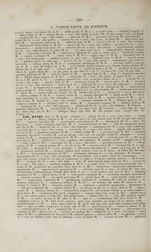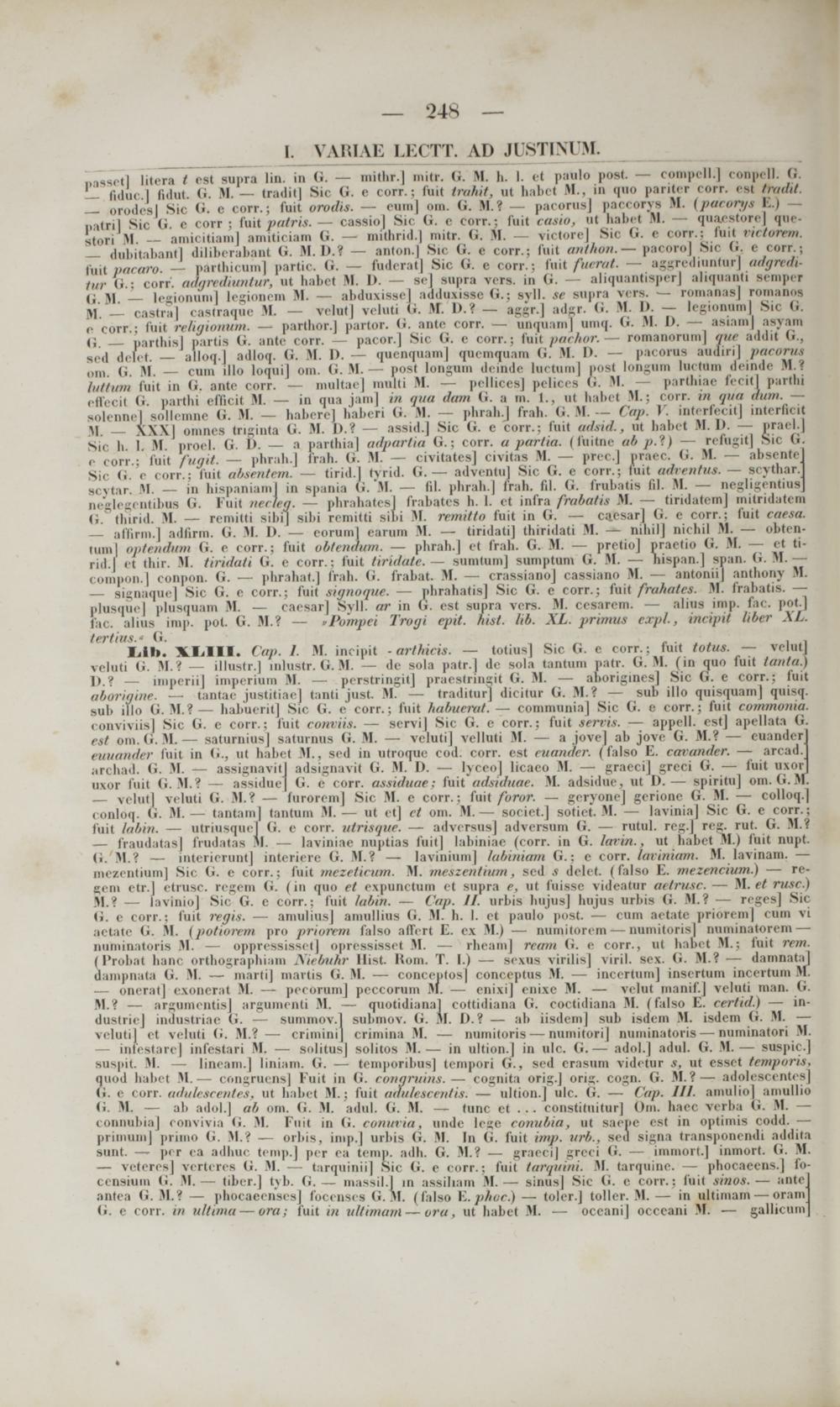 — dubitnbantj diliberaba.nl G. M.D.f — anton.) Sic G. e corr.; fuit anthon. — pacoro] Sic G. e cotf.j tuil pacaro. — parthicum] partic. (i. — fudcrat] Sic G. e corr.; fuil fuerat. aggredinnturj adgredi- tw '■■; corr. adgrtdiuntur, n( habet M. D. — se] supra vcrs. in G. — aliquantisper] aliquanti semper i. M legionumj legionem M. — abduxisse] adduxisse G.; svll. se supra vers. —■ romanas] romanoa M. — castraj castraque M. — relnt] veluti <■■ M. 1).? — aggr.| adgr. G. M. I). — legionum] Sii <■ c corr.; lini rehgionum. — parthor.] partor. G. ante corr. —. unquamj umq. G. M. 1). — asiamj asyam G. — parthis] partia G. ante corr. — pacor.] Sic G. e corr.; fuii pachor. romanorum] tnte addit G., scd dclct. — alloq.) adloq. G. M. I). — quenquam] qnemquara <i. M. I). — pacorus audirij pacarut nm. <■■ M. — cum illo loquij om. G. M.— post longuin dcindc luctuin] post longuin lurtnin deinde M.1 htttum fuit in (i. ante corr. — multae] raulti M. — pellices] pelices G. M. — parthiae fecitl parthi effecit G. parthi efficit M. — in qua jam] tn qua dam (i. a m. 1., ut habet M.; corr. in qua ttum. — solennel sollemne (i. M. — habcrc] babcri G. >l. — phrah .J frah. G.M.— Cap. V. interfecit] intcrficit M. — XXX] omnes triginta ti. M. 1).? — assid.] Sic G. c corr.: fuit adsid., m habet M. D. — prael.j Sic h. I. M. proel. G. I>. — a parthiaj adpartia G.; corr. a partia. (fuitnc ab pA) — refngit] Sic G. c corr.; fuit fugit. — phrah.] trah. <■. M. — civitatcs] civitas M. — prec.] praec. G. M. — absente Sii <■ e corr.; fuit absentem. — tiridj tyrid. <■.— adventul Sic G. e corr.; luit adventus. — scythar. scytar. M. — in hispaniaml in spania G. M. — 61. phrah.j frah. fil. <i. frubatis fil. M. — negligentins neglegi ntibua G. Fuit necleg. — phrahatesl frabates b. I. et infra frabatit M. — tiridatem] mitridaten G Ihirid. M. — remitti sibij sibi rcmitti sil>i M. remitto fuit in G. — ca .esar] G. e corr.; fuit caesa.