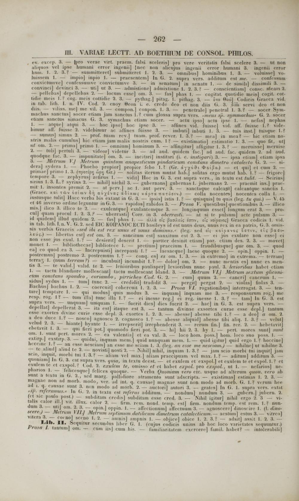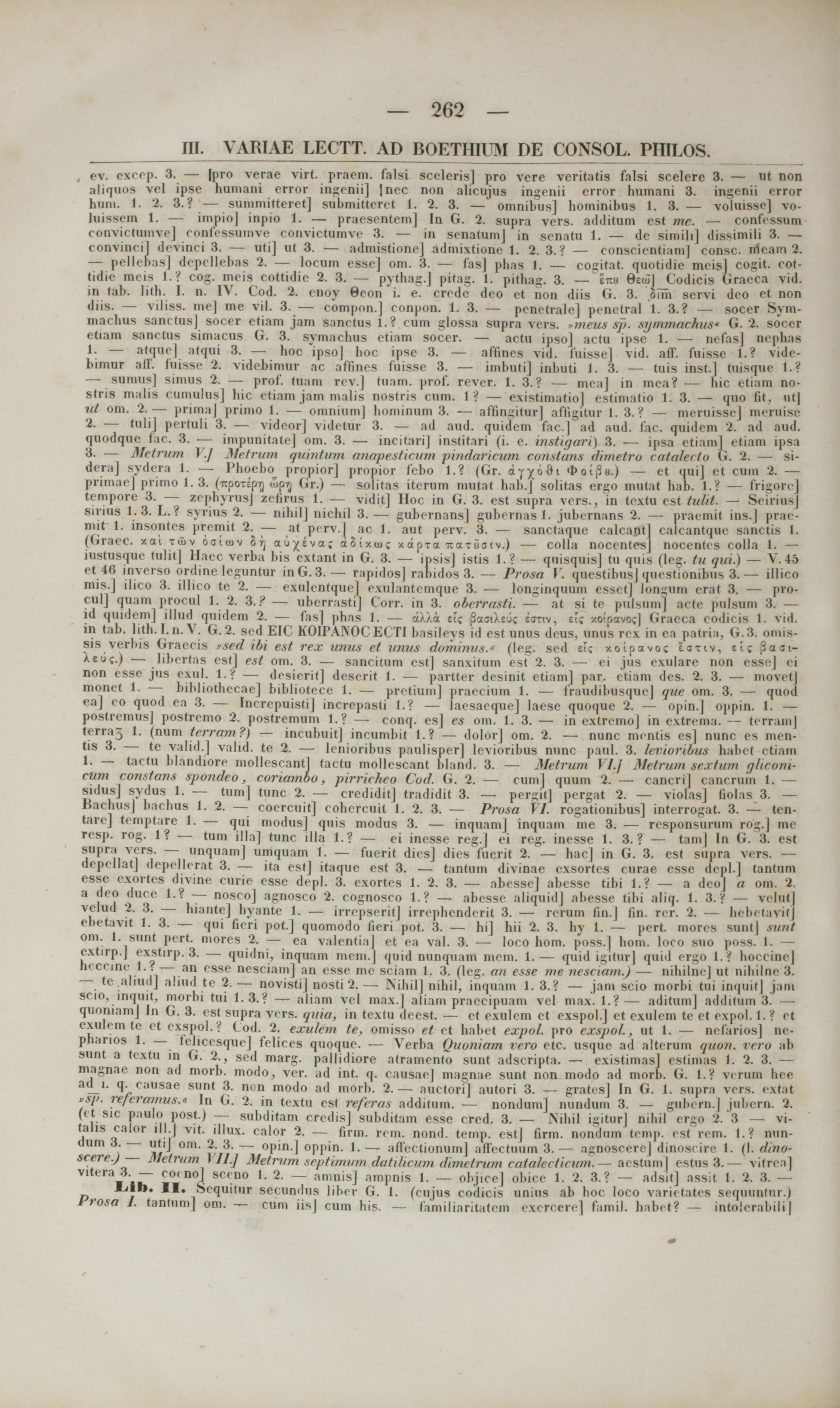 (Graec. xai tu>v oairov S tj aupva; aSixiuc «apu itaiioiv.) — colla noccntesj noccntes colla 1. — iiiMiivqur inlii| Uaec verba bis extant in G. 3. — insisj istis 1.? — quisquis| tn quis (l<ig. tn qui.) — V l"> et tti inverso ordine leguntur inG.3.— rapidosj rabidos 3. — Prosa V. questibus] questionibus 3.— illico mis.J ilico 3. illico te 2. — ezulentquej exnlantemqne 3. — longinquum cssetj longum eral 3. — pro- ciilj quam procul 1. 2. 3.? ■— ubcrrastij Corr. in 3. oberrasti. — al si !<■ piilsnmj acte pulsum 3. — id quidem] illud quidom 2. — fas] phas 1. — a)./.<i el? {jaaiXeuc eanv, et? xotpavoc] Gracca codicis 1. vid. in tab. lith.l.n.V. G.2. scd EIC KOIPAKOC ECTI basileys id esl nnus dens, unua rci in e« patria, G.3. omis- sis verbis Graceis »sed ibi est rex unus et unus domintts." (leg. sed eic xoipavoc tjtiv, ei; J3aai- Xeu{.) — lihortas est] est om. 3. — saneitum cstj sanxitum est 2. 3. — ei jus exulare non essej ei non osse jus exul. l.f — desieritj deserit 1. — partter desinit etiamj par. etiam des. 2. 3. — movet] monct 1. — bihliothecac] bibliotcce 1. — pretium] praecium 1. — fraudibusque] que om. 3. — quod ea] co quod oa 3. — InerepuistiJ incropasti l.V — laesaequej lacsc quoque 2. — opin.] oppin. 1. — postremus] postrcmo 2. postremum t.? — conq. cs] es om. 1. 3. — in extremo] in extrema. — terrajn] terra^ 1. (num terram ?) — incubuit] incumbit 1.? — dolorj om. 2. — nuno mentis esl nnnc es men- tis 3. — te valid.] valid. te 2. — lenioribus paulisperj Icvioribus nunc pauL 3. levioribus habel etiain 1. — tactn blandiore mollescantj tacto mdliescanl bland. 3. — Metrwn I/./ Metrum sextum ghconi- ctan constans spondeb, coriamoo, pirricheo Cod. il. 2. — cum] qunm 2. —. cancri) cancrnm 1. — sidiiv| sydna 1. — tum] tunc 2. — erediditj tradidit 3. — pergit] pergat 2. — violasj fiolas 3. — BacbusJ bachns 1. 2. — coercuit] cohercuit 1. 2. 3. — Prosa 1 /. rogationibns] intcrrogat. 3. — (< n tare] temptare 1. — qui modusj quis modus 3. — inquamj inquam me 3. — responsurum rog.] mc resp. rog. 1? — tum illaj tunc illa 1.? — oi in< ss< regj ei reg. nn sse 1. 3.? — tam] In G. 3. esl snpra vors. — unquamj umquam 1. — fuerit diesj dios fuejrit 2. — hacj in G. 3. est supra vers. depcllat] depellerat 3. — ita estj itaque ost 3. — tantum divinae exsortes ourae esse depl.] tantum essc cxortcs divine curie esse depl. 3. exortes 1. 2. 3. — abesse] abcsse tibi Lf — a dcoj a om. 2. a dco duce I.? — nosco] agnosco 2. cognosco 1.? — abcssc aliquidj ahesse tibi aliq. 1. 3 .f — vclut| velud 2. 3. — hiantej hyante 1. — irrepseritj irrephenderit 3. — rerum fin.] fin. rer. 2. — hebetavitj ebetavit 1. 3. — qui fieri pot.j quomodo fieri pot. 3. — hij hii 2. 3. hy 1. — pert. morea snnt] sunt om. 1. sunt pert. mores 2. — ea valentiaj et ea val. 3. — loco hom. poss.] hom. loco suo poss. U — extirp.] exstirp. 3. — quidni, inquam mem.j qnid nunquam mem. 1. — quid igiturj qnid ergo l .f hoccine] h< ccine 1.? — an esse nesciamj an esso me scinm 1. 3. (Icg. an esse ntc nesciam.) — nihilno] ut nihilne 3.