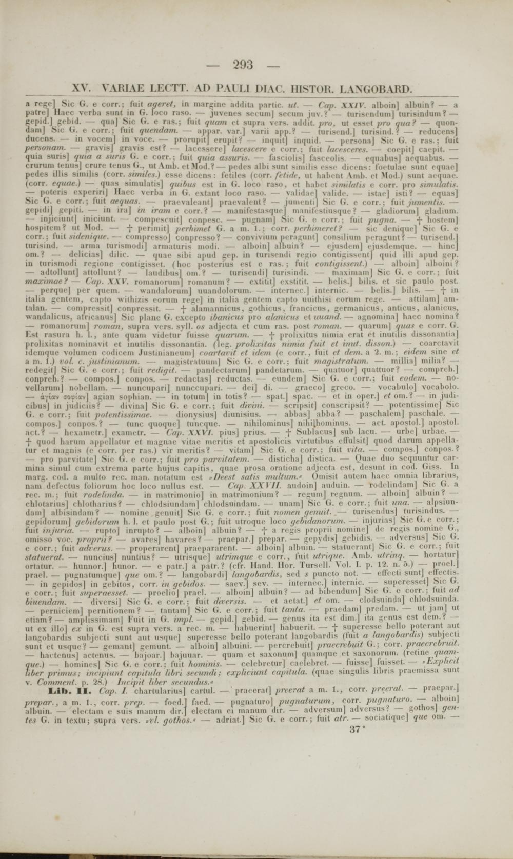 — pro parvitatcj Sic G. e corr.; fuit pro parritatem. — distichaj distica. — Ouae duo scquuntur car- mina siinul CUm cxtrcma parti' btnOI CtpttlS, quae prosa oratione adjecta est, dcsnnt in cod. Giss. In marg. cod. a multo rcc. man. notatum cst *I >rest satis mu/tum.' Omisit autcm hacc omnia librarius, naa dcfcctus foliorum boc loco nullus est. — Cap. XX .V1I. audoin] auduin. — rodclindam] Sic (i. a rcc. m.; fuit rude/inda. — in niatrimonio| in matriinonium? — rcgum| rcgnum. — alboin] albuin? — cUotariaaj eUotharinaf — chlodaiundam] chlodaaiadam. — anam] Sic G. e corr.; fuit una. — alpsiun- dam| albisinrlam? — nomine gcnuitj Sic G. e corr.; fuit nuincn gcnuit. — turiscmlus] turisindus. — gepidorum| gcliuluriim b. I. ct p.rulo pnsl (■.: linl utroquc loco tjehidanorum. injuriasj Sic G .C corr.; fuit iiijurta. — rupto] iaraptol — alboin] albuin? — -j- a regis proprii nomincj dc rcgis nominc (•.. omisso voc. pruprn? — avarcs] havarcs?— pracpar.J prcpar. — gepydis] gcbidis. — adversusj Sic G. e corr.; fuil adHerus. — properarcnt] praepararent. — alboinj allniin.— statuir.intj Sic (i. c corr.; fuit sttituerat. — nunciusj nuntius? — utrisquc| u/rimque. e corr., liiil ittriqitr. Amb. uttinq. — hortalurl ortatur. — bnnnor.] nanor. — e patr.| a patr. ? (cfr. Hanrl. Hor. Tursell. Vol. I. p. 12. n. 5.) — proel.] prar l. — pagnatmmrne] que om.? — langobardij langvbardis, sr rl a puncto not. — ciTr cti suntj cfTectia.