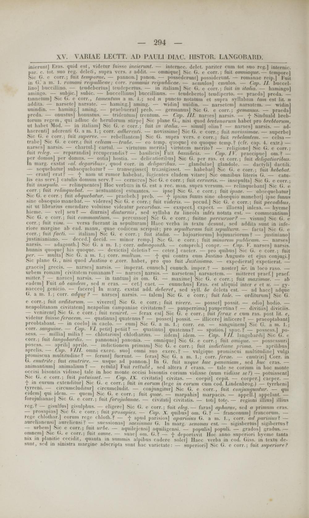 inienmtj Eras. quid cst, Tidctur fuisse ineiertmt. — intcrnec. delet. pnritcr cum tot suo rcg.J internic. par. c. tot. suo reg. delcti, supra vcrs. s addit. — omniquej Sic G. c corr.: fuit omniaque. — tempore| Sic G. e corr.; fuit temporae. — pannon.J panon. — possedcruntj possidcrunt. — romanae reip.J Fuit in G.' a in. 1. romani reipullieae; corr. romanis reipublicae. — aemulosj cmulos. — Cap. II. buccel- linoj buccillino. — teudebertusj tcudcpcrtus. — in italiam) Sic G. c corr.; fuit in italia. — liamingo| amingo. — subjic.J subic. — bucccllinusj buccillinus. — teudebertoj teudipcrto. — praedaj preda. — tannetumj Sic G. c corr., tamentum a m. 1.; sed n puncto notatum et supra syllabam tam est lit. n addita. — narsetej narsate. — hamir.g.J aming. — widinj uuidin. —■ narsetem] narsatem. — widinj uuindin. — haming .j aming. — praebueratj preb. — gcrmanusj Sic G. c corr.; gemanus. — praedaj preda. — onustusj lionustus. — tridentum) trentum. — Cap. III. narsesj narsis. — -j- Sinduald brcb- torum regcm, qui adhuc dc herulorum stirpej Sic plane G., nisi quod bretonorum habet pro brcbtorum, ut habet Mod. — in italiamj Sic G. c corr.; fuit 01 italia. — simulj olim? — narscsj narsis. — ad- haerentij adcrcnti G. a m. 1.; corr. adhcrenti. — novissimej Sic G. e corr.; fuit norissimae. — superbe] Sic G. e corr.; fuit superve. — rebellantemj Sic G. supra vcrs. e corr.; fuit rebelantem. — celsa — trabe] Sic G. e corr.; fuit celsam — trabe. — co temp. q-.ioquej eo quoque tcmp.? (cfr. cap. 4. extr.) — narscsl narsis. — chartul.J cartul. — virtutum meritaj virtutcm merito? — religionej Sic G. e corr.: fuit rclcg. — reparandisj recupcrandis? — basilicisj Fuit bassi/icis. — Cap. IV. praccipuej om.? —