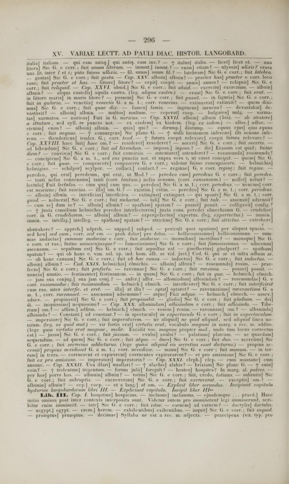 — imperalorej Sic G. e corr.; fuit imperatorem. — ne aliquiilj ne qiiid aliquid, sed a/n/iint Imca no- tatum. (leg. ne quid mat.) — vir fortis eratl rirtutis erat, vocabulo magnae in marg. a rec. m. addito. (lege quia rirtutis erat magnae, molir. Lxcidit voc. magnae propter mol., unde tum locus correctus est.) — jussu] Sic G. c corr.: (uit jussum. — evulsij avulsi? — palatium] plateam. — sc quaedam| sequendum. — ad quem] Sic G. e corr.; fuit atque. — duos] Sic G. e corr.; fuit duo. — secretiusj Sic G. e corr.; fuit secrecius addicturus. (lege quasi a/iquid eii secretius esset dicturus.) — propius ac- cessitl propius aceidisset S m. 1.; corr. ui inliwr. — manuj Sic G. e corr-: fuit inanum. — in ter- ram] in ti rra.— corrucrcnt ct cxpirarent] corrtrentes expirararent?— et pro amissione] Sic (i. e corr.; fuit ex prn amisione. — imperatori] imperatoris? — Cap. XXXI. clc]ih.J clcp. — cum massane] cum ansanc.— Ca/i. XXXII. Uva illarij uuallari?— -\ alachis) alahis?— brixiamj Sic plane — + cuin| eoin? — + tridentum] trigentum.— forom julii] forojuli? — hostesj hospites? In in;irg. al. patres. ■— per hosj porro hos. — albuuinj albuin? — totiusj Sic G. e coit . : (uit, credo, totiuus. — snbrutisj Sic G. e corr.; fuit subruptis. — excreverantj Sic G. e corr.; fuit excreverat. — exceptisj om. ? — albuuin) albuin? — cep.] cocp. — et a lang.J et om. — Explicit liber sccundus. Incipiunt capitula hystonai langobardorum libri III. — Expliciunt capituia. tncipit Hber III 1 "