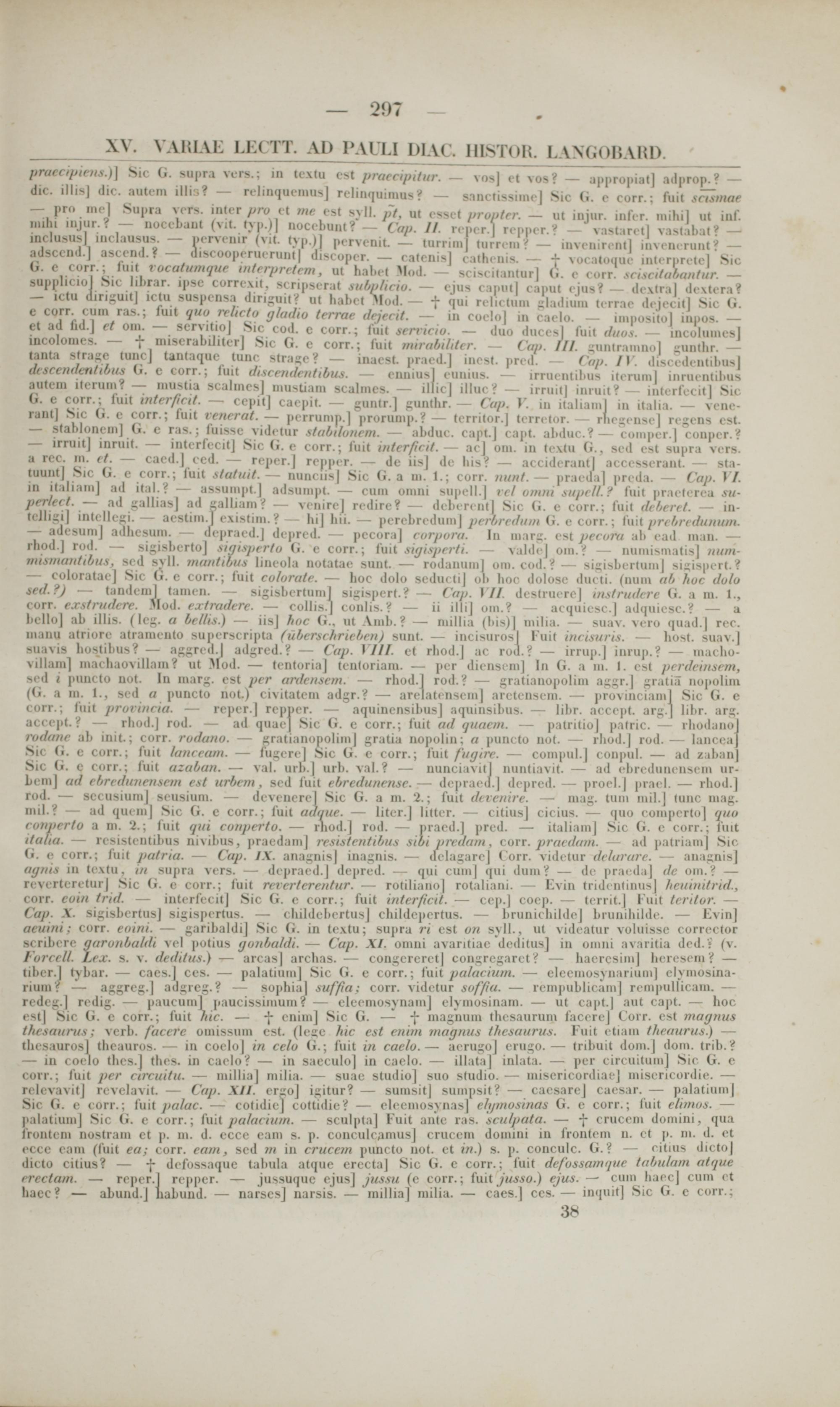 — coloratacj Sic (5. e corr.; fuit colorate. — boc dolo scductij ob hoc dolose ducti. (nuiii ab hoc doto sed.?) — tandcmj tamen. — sigisbcrtunij sigispert.? — Cap. 17/. dcstruerej instrudcre G. a m. 1., corr. e.rstrudere. Mod. citradere. — collis.J conlis.? — ii illij oin.? — acquiesc.J adquicsc? — a bello) ab illis. (leg. a be/lis.) — iisj hoc G., ut Anih. ? — millia (bis)| milia. — suav. vero quad.] rec. niaiiu atriorc atramcuto supcrscripta (uberschrieben) sunt. — incisurosl l "uit intisiiris. — host. suav.| siiavis hostibus? — aggrcdj adgrcd.? — Cap. VIII. ct rhod.J ac rod.? — irruji. J inrup.? — macho- villamj inaehaovilhiiii? ut Mod. — tcntoriaj tcnloriam. — pcr dienscm] In G. a m. I. cst prrdrinsrm, scd i puncto uot. In mar^. cst prr art/rnsrm. — rhod.J rod. ? — gratianopolim aggr .J gratia nojiolim ((i. a m. 1., scd a puncto not.) civitateni adgr.? — arelatensein] areteiisem. — jiroviiitianij Sic (i. e corr.; fuit prorinria. — rcper.| rcpper. — aquinensibus] aquinsibus. — libr. acccpt. arg.] libr. arg. accep &f — rhod.J rod. — ad quaej Sic G. c corr.; fuit ad qtiacm. — patritio] ji .itric — rhodano rodane ab init.; corr. rodano. — s r atiano|iolimj j ;ratia nopolin; a punctu not. — rhod.| rod.— lancca Sic (i. e corr.; fuit lanrram. — fu^ere] Sic G. e corr.; fuit fiiijtrr. — COmpul .J conpnl. — ad zaban Sic G. c corr.; fuit azaban. — val. urb.| urb. val.? — nunciavilj nuntiavit. — ad ebrcdiincnscin ur- befflj ad rbrrdiinrnsein rst urbrm, scd fuit ebrcduncnsc. — depraed.] dcpred. — proel.| jiracl. — rhod .J rud. — sccusiumj scusium. — dcveucrel Sic G. a m. 2.; fuit di renire. —■ mag. tuni mil .J tunc niag. mil.? — ad queinj Sic G. c cerr. ; fuit adtiue. — litcr.J littcr. — citiusj cicius. — quu comperto] quo cotiperto a ni. 2.; fuit qtti conperto. — rnod.J rod. — praed.J pred. — italiam| Sic G. c corr.; jnit italia. — resistentibus nivibus, pracdamj resistentibtis sibi/iretlam, corr. praedam. — ad jiatriam] Sic, G. c corr.; fuit patria. — Cap. IX. anagnis| inagnis. — delagare] ( orr. videtur de/arare. — ana ^nisj riijins in teztn, in supra vers. — dcpraed.] dcprcd. - qui cum| qui duin? — de pracda] dc om.? — rcvcrterctur| Sic (i. e corr.; fuit revcrtcreiitur. — rotiliano] rotaliani. — Evin tridentinusj lieiiinitrtd., corr. cuin trid. interfccit] Sic G. e corr.; fuit interftcit. — cep .J cocp. — territ] Fuit terilor. — Cap. X. sigisbcrtllsj sigispcrtus. — < liildchertus] cliildejicrtiis. - bninii hilde | biunihildc. — EvinJ aeuuit: corr. eoini. — garibaldij Sic G. in tcxtu; supra ri cst on syll., ut vidcatur voluissc corrcctor scribcre garunbtildi vel potius goitbaldi. — Cap. XI. onini avaritiac dcditusj in oinni avaritia ded.: (v. Forccll. Lex. s. v. deditus.) — arcasj archas. — congcrcrct| congregarct? — hacrcsim| hereaemf — tiber.J tybar. — caes .J ces. — palatiumj Sic G. e corr.; fuit palacium. — elecmosyiiarium] clyinosina- rium? — aggrcg.] adgrcg.? — sophia| suffia; corr. vidctur soffia. ■ — rempublicam] rcmjiullicain. - redeg.J redig. — paucuml paucissimum? — elcemosynainj elymosinam. — ut capt] aut capt. — hoc estj Sic G. e corr. ; fuit hic. — -j- cnimj Sic G. — -}- magnum thesaurum faccrcj Corr. cst tnamui lliesaiirus; vcrh. facerc omissum est. (Iesc hic cst enon magrtirs lliesaurus. Fuit etiam t/iraurus.) — theaanros] thcauros. — in coclo] in cclo (i.; fuit in cac/o. — acrugo] erngO.— tribuit doni.J dom. trib.?