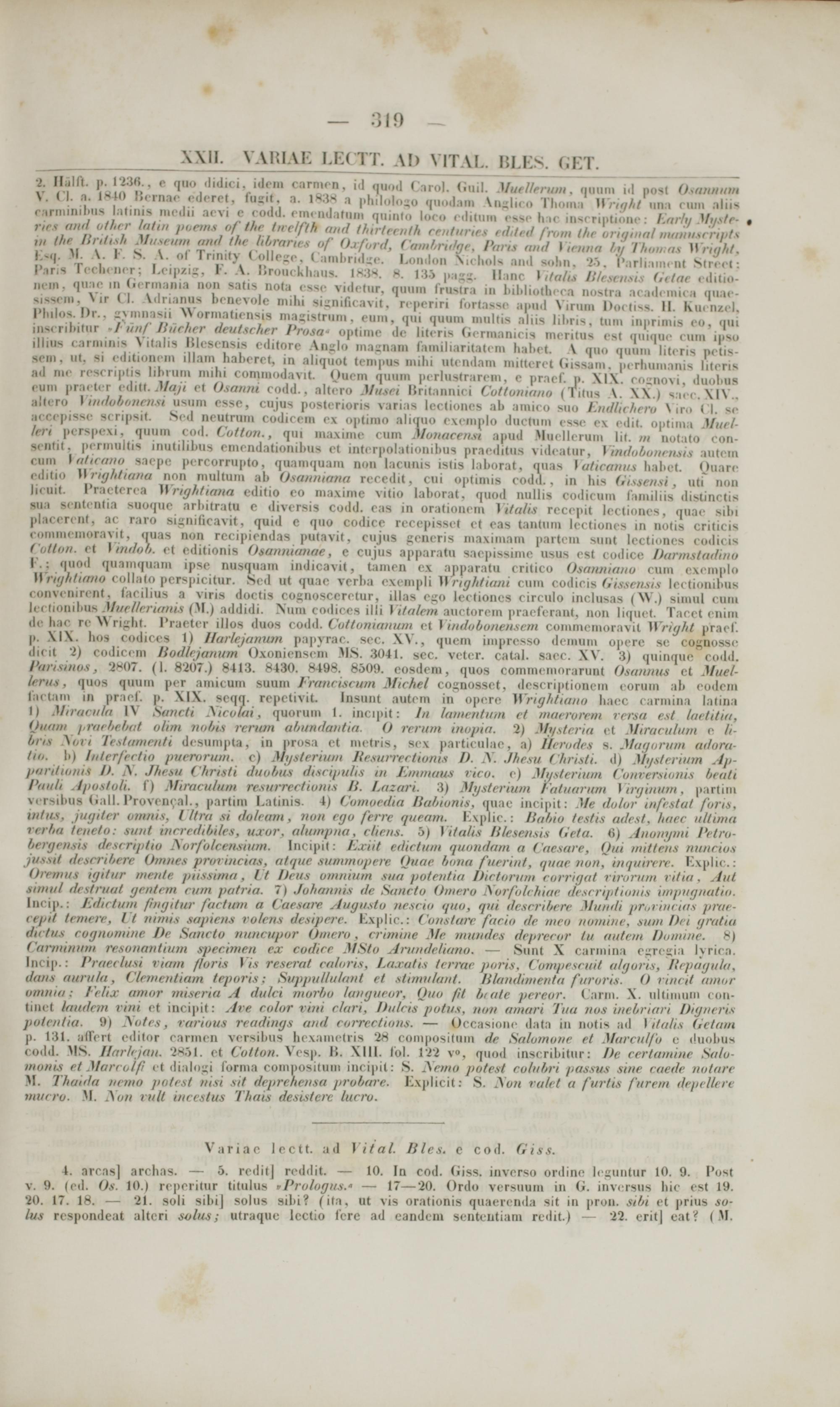 V. Cl. a. Bemae e~deret, fujit. a. 1*3* a pbjlotogo quodam Voglieo Hhmm Wrifhi um nnn aliis tnrminibns latinia medii arvi c codd. <m< ndatum qninfo Iom oditum iMr h a c iMcriptMMM: Early Mystc- • r/V.o «//'/ of /irr liittn jiuems uf /he tnclflh fnul Ihirtrrnlh centnrtcs eihted frum thr uriguial nuinusrripts ui Ihr British Miiseum and the lihrarics of Ojfurd, Cam/iridge, 1'ttris anil Ytciuia /y Thtm .as W rttjht. i;«q. M. \. ¥. S. A. ol' Trinity Cstiege, ( amhndso. L<nulon NiokaM aml sohn, 25. 1 'arliaincnt Streot: l\ins Teeh< nor: l.eipzis, F. A. I>rou< kli .ius. 1-:!*. k . i :}.> p .i »s. llanc I tla/ts B /rsiitsts lnlai > dilio- iicni. nnae in (iermania non satis nota cssc vidctur, quiim Irustra in lnliliotln i a nostra aoadomicn quae- liasem, Vir ( I. \drianus hcncvole miki sisnificavit. reperiri fortasso apud Viruni Docliss. II. Kucnzel, 1 'hilos. Dr.. gvmnasii WofmitktM|a niasistruin . cum, qui quuiii iniillis aliis lihris, tum inpriniis eo, qui inserihilur ■ //////' Bticher detitscher Prosa- optiine de litcris (icrmanicis mcritus cst quiquc cuin ipso illius carminis Vitalis Blcscnsis cditorc Anslo ma.snam familiaritatem hahct. V quo quuiu litoris petis- scin . ut, si editionom illam haheret, in aliquot tcnipus inihi utcndam mittcret (iissam. pcrhunianis literis ad mc rescriplis librnm mihi commodavit. Oucm qunin pcrlustrarem, c pracf. ji . \l\. cosnovi, <luohus oum praeter edilt. Mqjt et Osanni co<ld.. alt <To Miisct liritannici Cottoniano (Titus V. \\.) sacc. XIV.. altcro I iiidobunrnsi usum csse, ciijus postorioris varias lcctiones ah amico suo l.mllu hcru Viro < I. sc aeeepisse acripsit Sed neutrum codicem ex optimo aliquo cxemplo ductuin cssc cx odil. optima Muel- leri pcrspcxi, quum cod. Cotlon., qiu inaximc cum Monacenxt apud Muellcruin lit. m uotato con- setitit. pcrmultis inutilihus cniondationihus ct intcrpolationibus pracditus videatur, Vjttdohonetttis aiitcm cum \attcano sacpc percornipto, qwmquam non lacuoia istis lahorat, quas I atiramis liahot. Ouare editio WrightiatUi non niultum ah Osanniana recedit, cui optimis codd.. in his Oitttnti , uti non licuit. Praeterea IVrightiana editio eo niaxime vitio lahorat. quod nullis codioum fainiliis distinctis sii i scntontia suoquo arhitratu c divcrsis codd. oas in orationom Mta/is rocopit lcclioncs, quac sihi placcrcnt. ae raro sisnificavit, quiil c quo codicc rocepisscl et oas tantiini lcctioncs in notis criticis coniincinoravit, quas non rceipicndas putavit. cujus gonoris inaxiniam partoni sunt lcctionos codtcia ( titlon. ct I iittlob. ct editionis Osaiuuanae , o cujiis apparatu sacpissimo usiis ost codice Darmsladinu