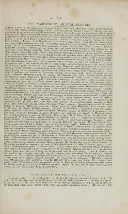 oonvcnirent. faeilius a viris doctis cognosceretur, illas egO lectioncs circulo inclusas (\V.) siimil ouni leclionihus MueUeriaiits (M.) a<ldi<li. Nuin codioos illi Ytta/cm aiictorem pracfcr.int. non liquet. Taeet enim ili bac ro XVright. Praeter illos duos eoihl. Cottonianunt ot Yindiibonenxcm coinmemoravit Wrig/tt pracf. p. Xl\. hos codiccs 1) lliulcjainim papyrac. sec W., quem impresso demum opcre sc cognosso dicit 2) eodieem Hoi/lcjaiuim Oxonicnseni MS. 3(141. scc. veter. catal. saec. XV. 3) quinque codd. 1'ttrftitos, 2*07. (1. 8207.) 8413. 8430. 8498. 8509. eosdem, quos commoinorarunt Osannus ct Mtiel- Ii i-ii.s . quos quum per amicum suuin Franrixcum Michel cognossct, descriptioncin corum ah eodem factam ta praef. p. \l\. soqq. repctivit. Insunt autom in opore Wrtgh/iaiw haec canaiM UtiM I) Miracii/a IV Saiiclt Xirouii , quorum 1. incipit: /// /amcitttim ct macrorem rrrsa est /aetiiia, Qtnm pnehebat oBm noiit renan abunt/antia. O rrntm majaia. 2) 9kuteria < t Miractilnm <• //- trit yovi Tnt ametU i deanntpaa, in pmsa et metris, s< x nartienlae, a) Serodn s. Magorum ai /oru- lio. h) litlerfrt tii) purroruin. < ) Mi/slcriiuit ltesurrctttoiiis I). X Ihrsu Chrisli. d) Mi/slcrunn A\i- jinntuiiits I). A. Jhcsu ( hristi iliinbiis i /ixiijiii /is ut Emmaus VtCQ, i ) Mi/stcritiiii CoitVtTlionu bcatt Pttttli .I/iostoli. f) Mtraciilum rexiirrcrtumtx IS. I.azari. 3) Mi/xleritim laltiariiiii \ u ijiitiim , partim versibm GalL ProvMoal., pajtjaj l.atinis. 4) (Jomurttia llabionis, anae iactpit: Me doior utfettat forit, uitiix. jnijiler umnis. I Itra si tlu /eam, non rgo ferrc quram. Kxplic.: Ila/ito lcstis adett, haec u/tima rerliu trnelu: sunt inrrri/tbi/cx, ujcor, alumpna, ctiens. 5) Yitalts /1/eseiisix (,'cta. 6) Anunymi l'elru- bergriisis ilcxcrijitiu .\urfulren.sium. Incipit: Exnt edietum pioudam a Caexare, Otit mittttlt ntntcius fUttii desrribere Omnes prurincias, atqtte summujicrc Ouar buna /iierint, qitae non, inqiitrcrr. Kxplic: Orentus itjittir nicute /liissitna, /'/ Itcits umniuin sua jiotentia Dirturnm rurrttjat rirurum ritia. Aut ttmut ili ltntmt oetttem cum patria. 7) Juhnnnis ile Sancto Omero t\orfu /i hiar i/cxrrijiliuiiix imjiugnatio. [acip.: KtHctum fmgitur factum a Caesaiv Augusto metcio ouo, qui mettrihert Mtnuli provincias prae-