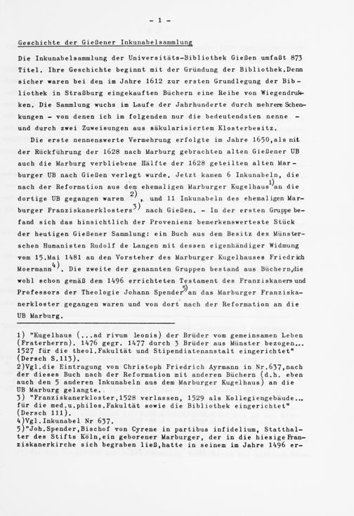 Die Inkunabelsammlung der Universitats-3ibliothek Gießen umfaßt 873 Titel. Ihre Geschichte beginnt mit der Gründung der Bib1iothek.Denn sicher waren bei den im Jahre 1612 zur ersten Grundlegung der Bibliothek in Straßburg eingekauften Büchern eine Reihe von Wiegendruk- ken. Die Sammlung wuchs im Laufe der Jahrhunderte durch mehrere Schenkungen - von denen ich im folgenden nur die bedeutendsten nenne - und durch zwei Zuweisungen aus säkularisiertem Klosterbesitz.