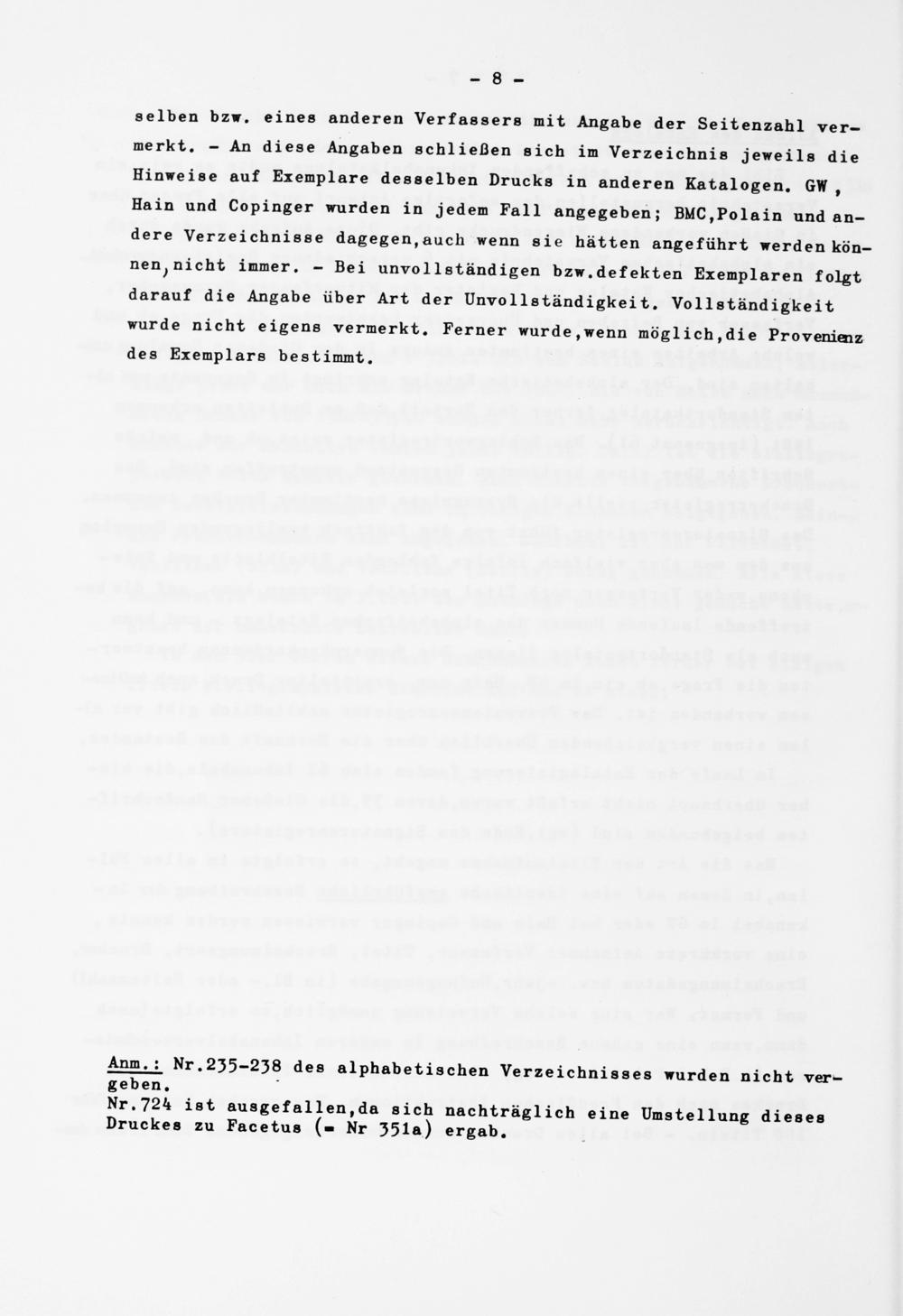 selben bzw. eines anderen Verfassers mit Angabe der Seitenzahl vermerkt. - An diese Angaben schließen sich im Verzeichnis jeweils die Hinweise auf Exemplare desselben Drucks in anderen Katalogen. GW , Hain und Copinger wurden in jedem Fall angegeben; BMC,Polain und andere Verzeichnisse dagegen,auch wenn sie hätten angeführt werden können^ nicht immer. - Bei unvollständigen bzw.defekten Exemplaren folgt darauf die Angabe über Art der Unvollständigkeit. Vollständigkeit wurde nicht eigens vermerkt. Ferner wurde,wenn möglich,die Provenienz des Exemplars bestimmt.
