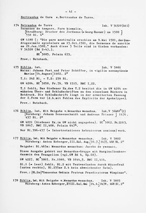 T .l fehlt. Das Gießener Ex.des T.2 besitzt die in GW 4204 erwähnten Über- und Schlußschriften zu den einzelnen Büchern in Rotdruck. Die Schlußschrift liegt in der erweiterten Fassung der 2.Form vor (d .h.mit Fehlen des Explicits der Apokalypse).