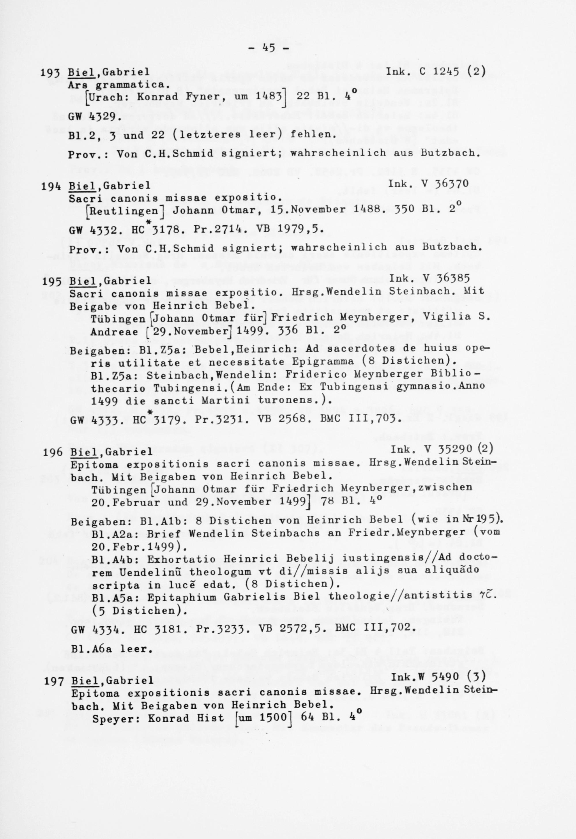 195 Biel .Gabriel Ink. V 36385 Sacri canonis missae expositio. Hrsg.Wendel in Steinbach. Mit Beigabe von Heinrich Bebel.
