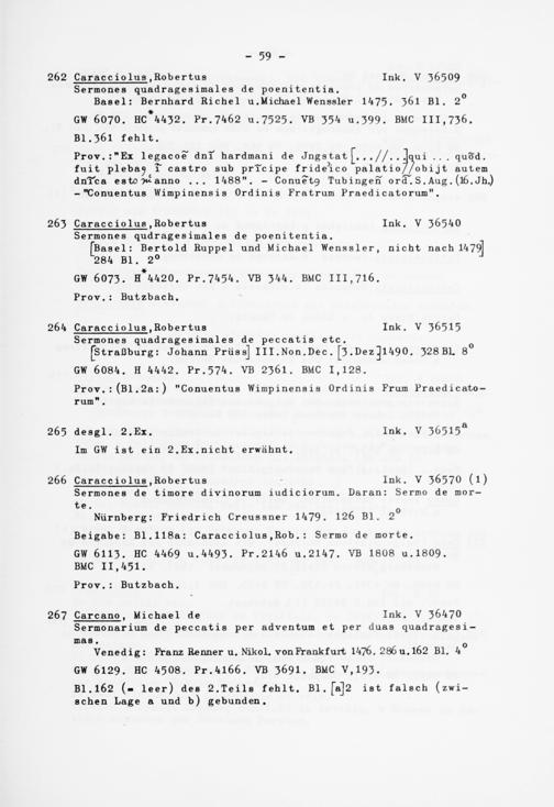 264 Caracciolus .Robertus Ink. V 36515 Sermones quadragesimales de peccatis etc.