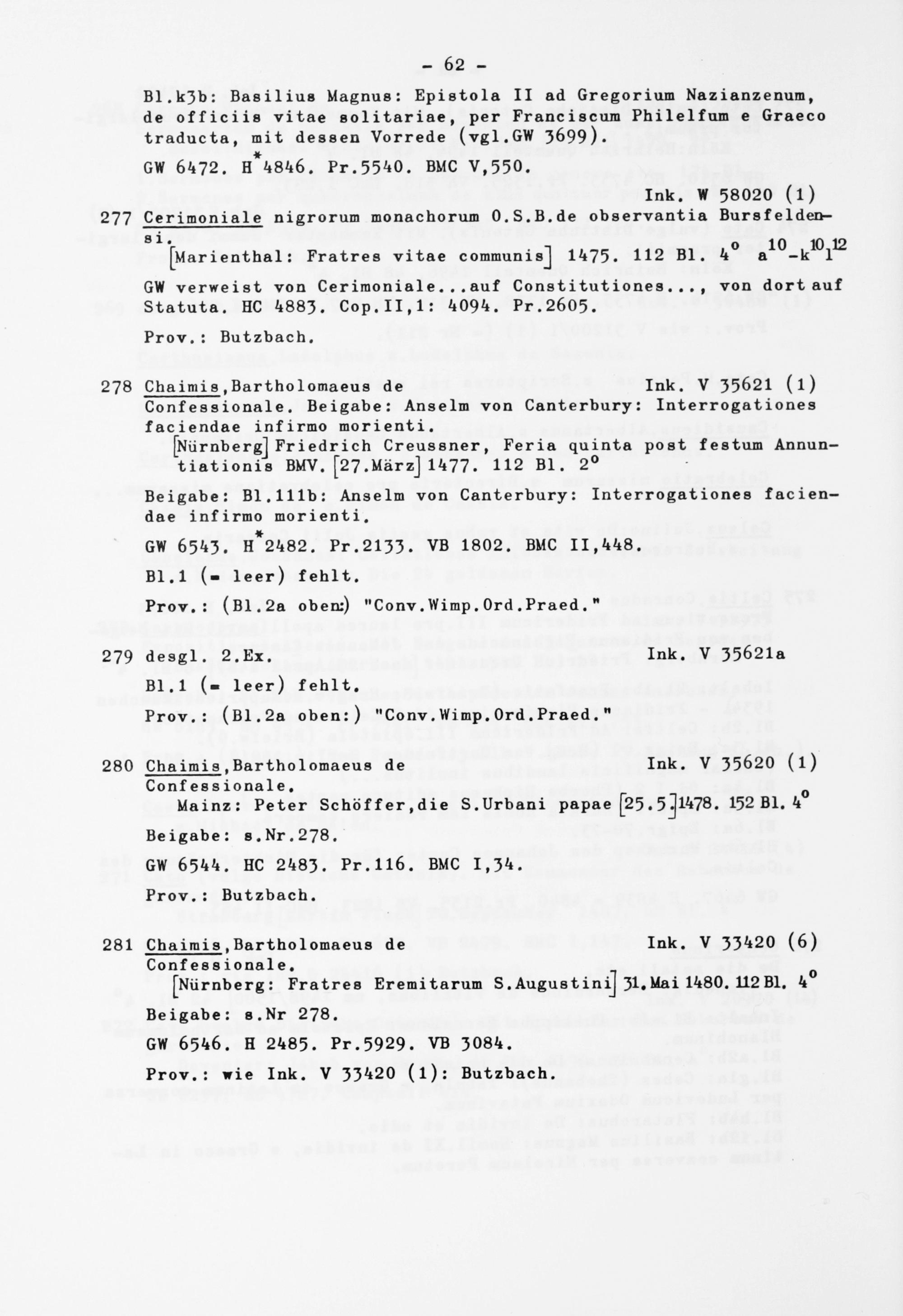 278 Chaimis ,Bartholomaeus de Ink. V 35621 (l) Confessionale. Beigabe: Anselm von Canterbury: Interrogationes faciendae infirmo morienti.