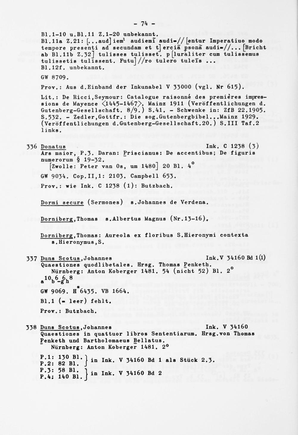 Lit.: De Ricei,Seymour: Catalogue raisonne des premieres impres- sions de Mayence <(l445-1467/ > . Mainz 1911 (Veröffentlichungen d. Gutenberg-Gesellschaft. 8/9.) S.41. - Schwenke in: ZfB 22 .1905. S .532. - Zedier.Gottfr.: Die sog.Gutenbergbibel...Mainz 1929. (Veröffentlichungen d.Gutenberg-Gesel1schaft. 20 . ) S.III Taf.2 1inks.
