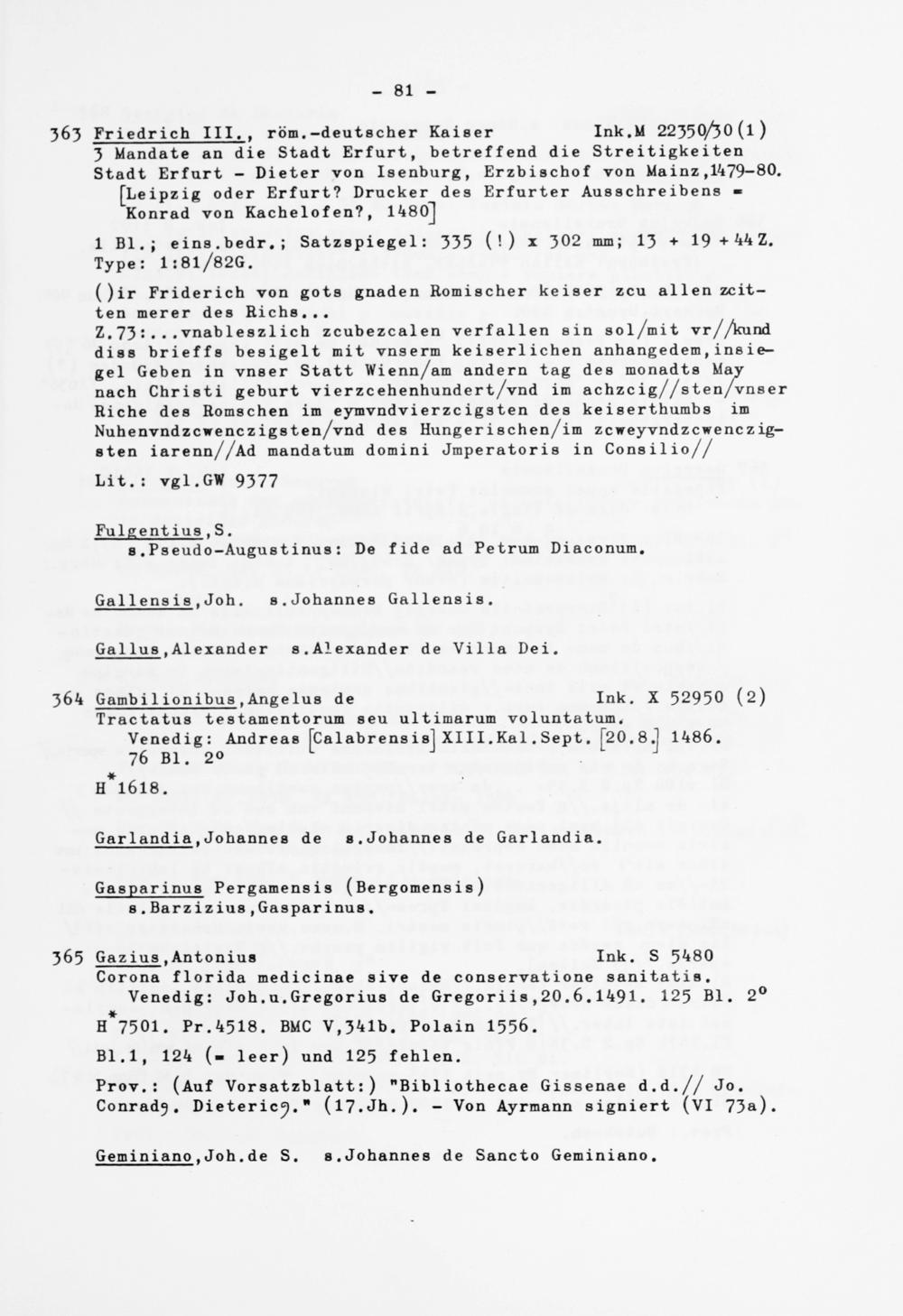 363 Friedrich III. , röm.-deutscher Kaiser Ink.M 22350/30 (l) 3 Mandate an die Stadt Erfurt, betreffend die Streitigkeiten Stadt Erfurt - Dieter von Isenburg, Erzbischof von Mainz ,1479-80.