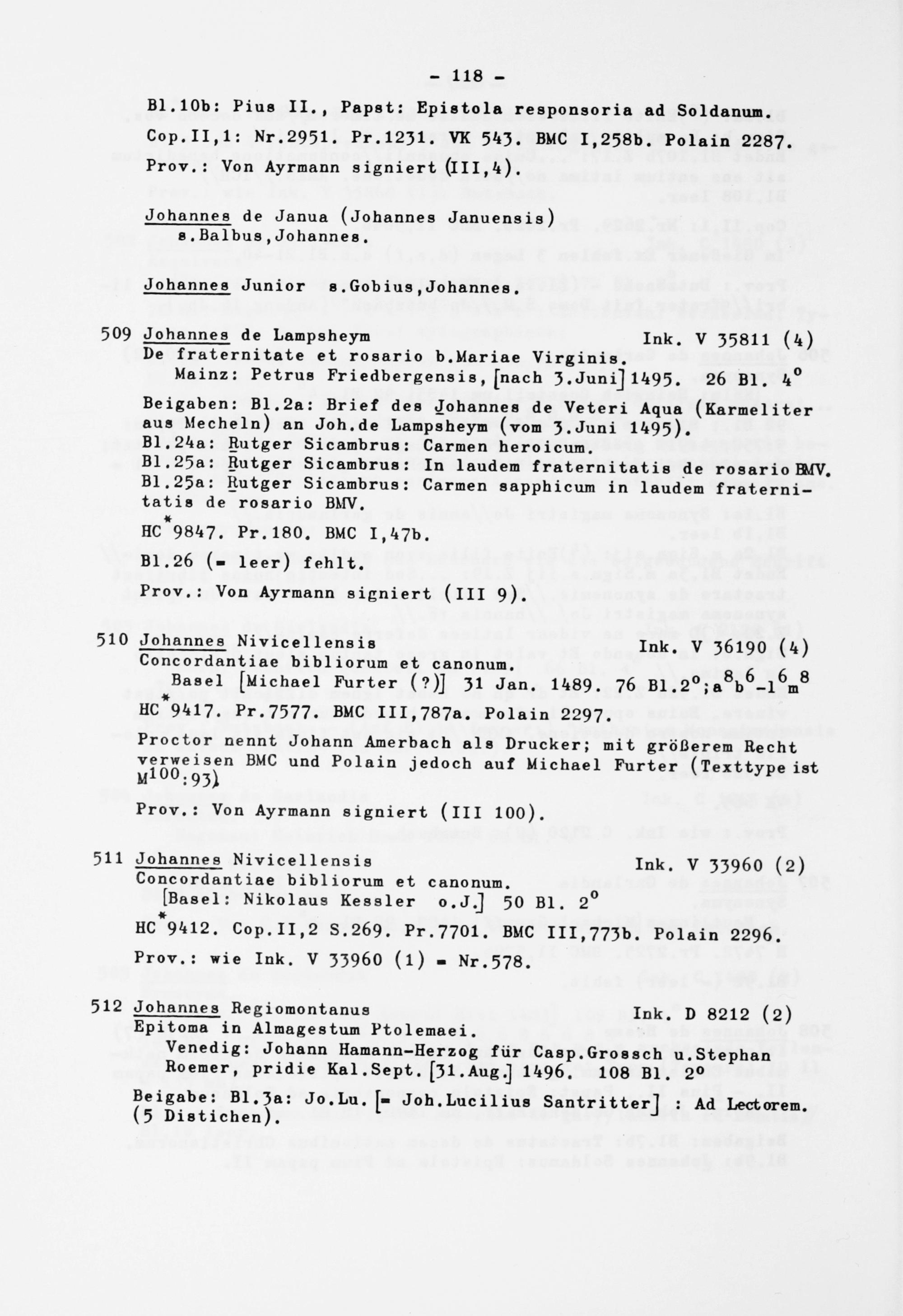 Bl.lOb: Pius II., Papst: Epistola responsoria ad Soldanum. Cop.11,1: Nr. 2951. Pr .l23L VK 5 <»3. BMC I,258b. Polain 2287. Prov.: Von Ayrmann signiert (III, 4 ) .