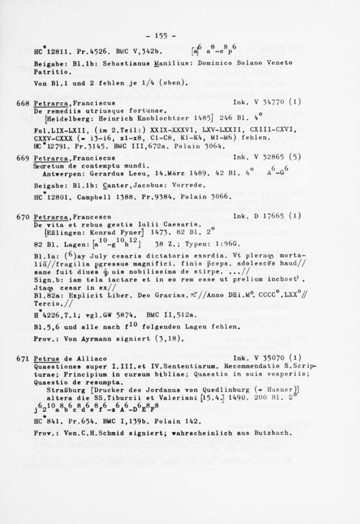 668 Petrarca .Franciscus Ink. V 3 ^770 (l) De remediis utriusque fortunae.