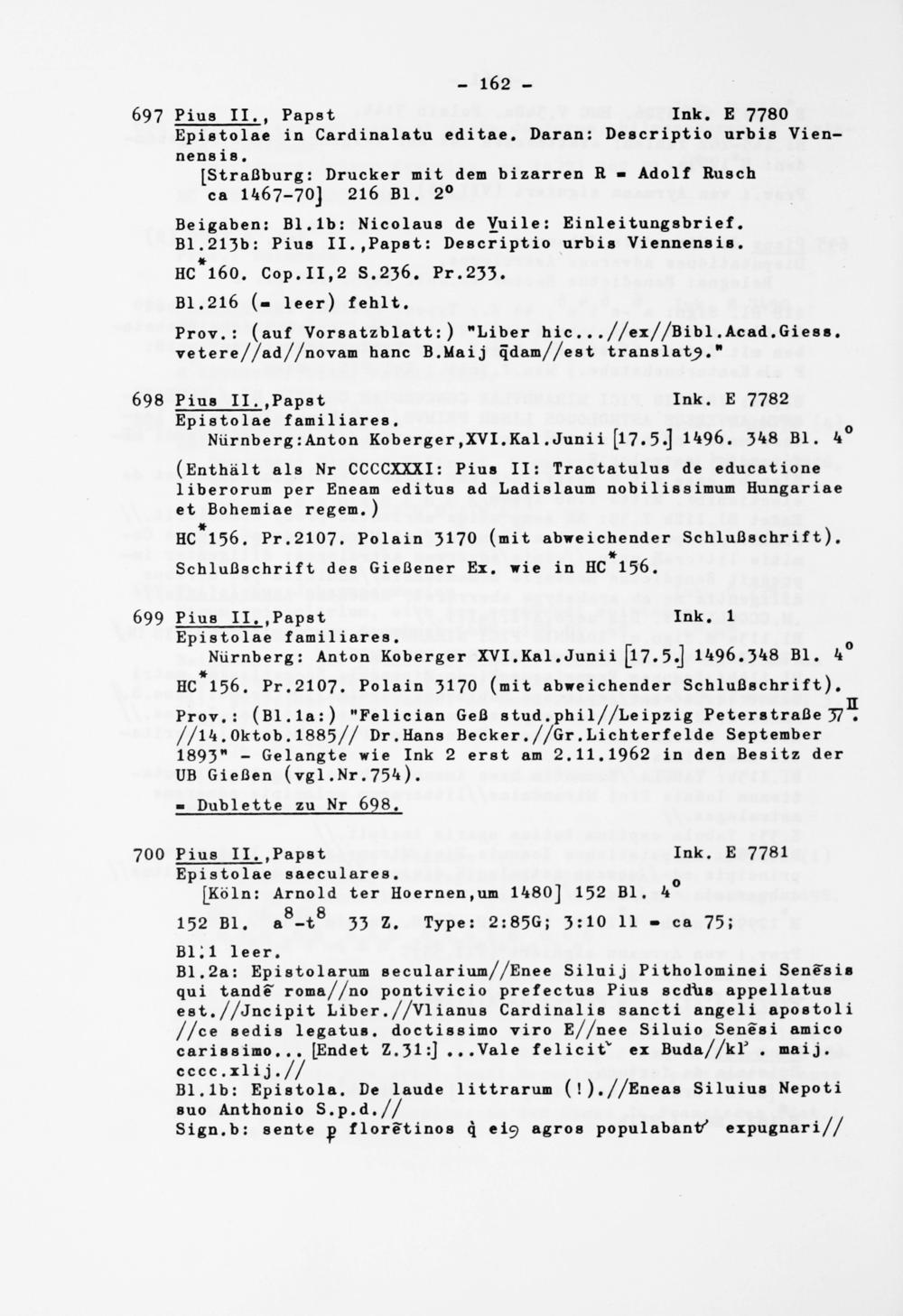 697 Pius II. , Papst Ink. E 7780 Epistolae in Cardinalatu editae. Daran: Descriptio urbis Vien- nens is.