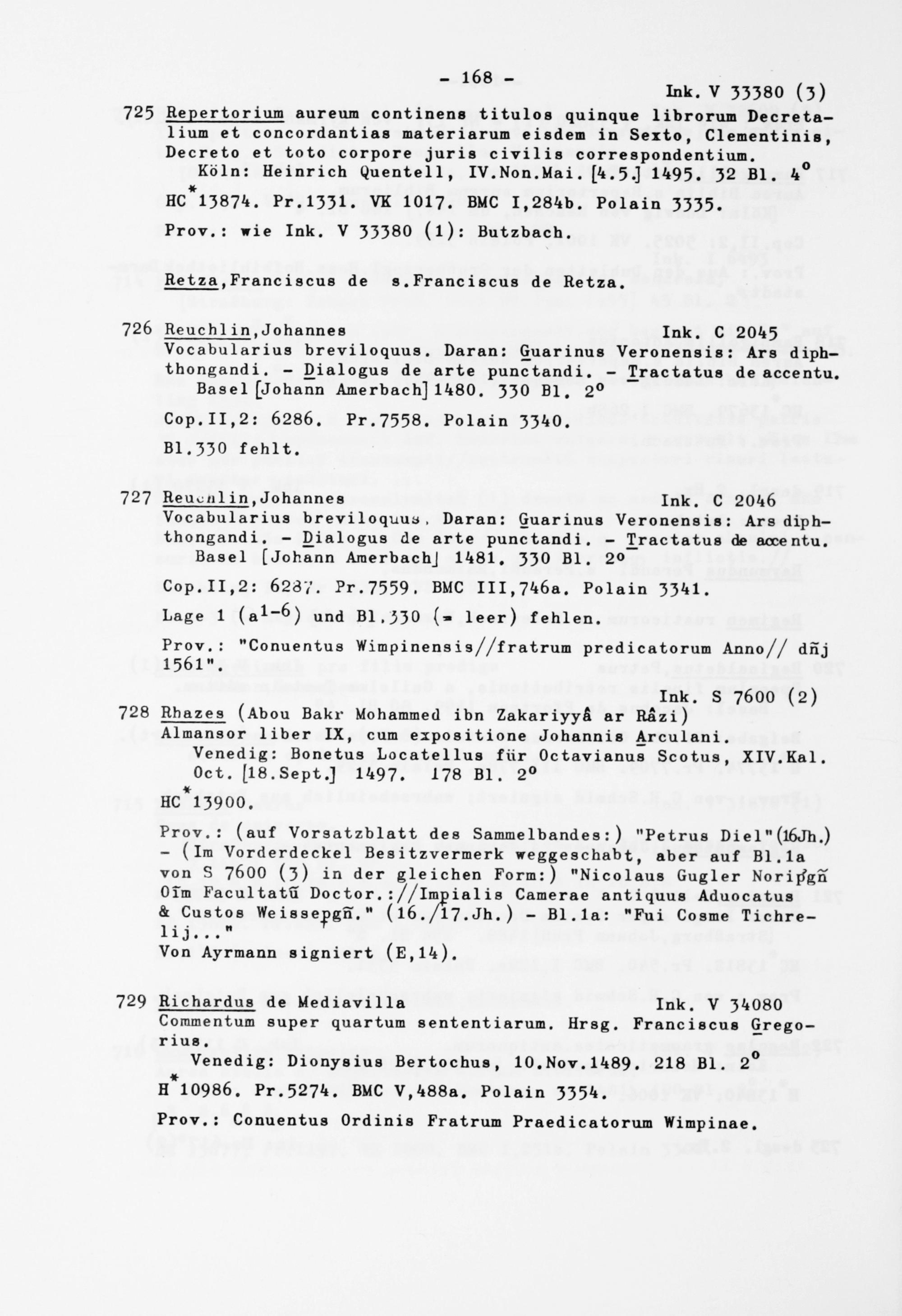 Venedig: Dionysius Bertochus, 10.Nov.1489. 218 Bl. 2° H*10986. Pr.5274. BMC V,488a. Polain 3354. Prov.: Conuentus Ordinis Fratrum Praedicatorum Wimpinae.