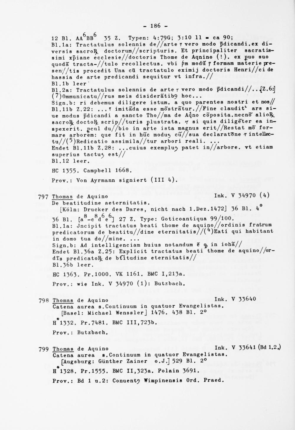 36 Bl. [a 8 -c 8 d e 6 ] 27 Z. Type: Goticoantiqua 99/100. Bl.la: Jncipit tractatus beati thome de aquino//ordinis fratrum predicatorum de beatitu//dine eternitatis//(*)Eati qui habitant in domo tua do//mine. ...