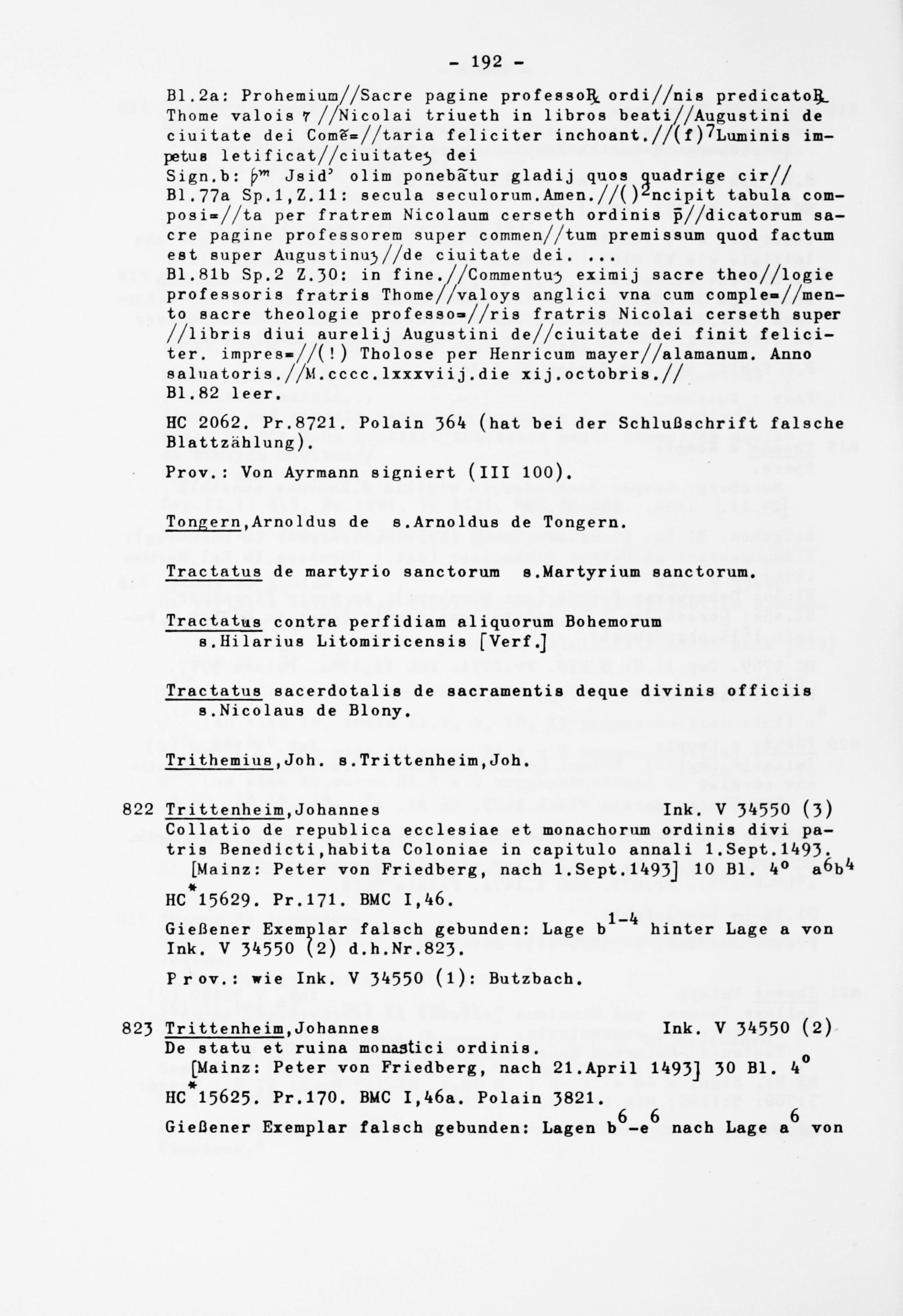 B1.81b Sp.2 Z .30: in fine.//Comraentu} eximij sacre theo//logie professoris fratris Thome//va1oys anglici vna cum comple=//men- to sacre theologie professo=//ris fratris Nicolai cerseth super //libris diui aurelij Augustini de//ciuitate dei finit feliciter. impres»//(!) Tholose per Henricum mayer//a1amanum. Anno salnatoris.//M.cccc.lxxxviij.die xij.octobris.// B1.82 leer.