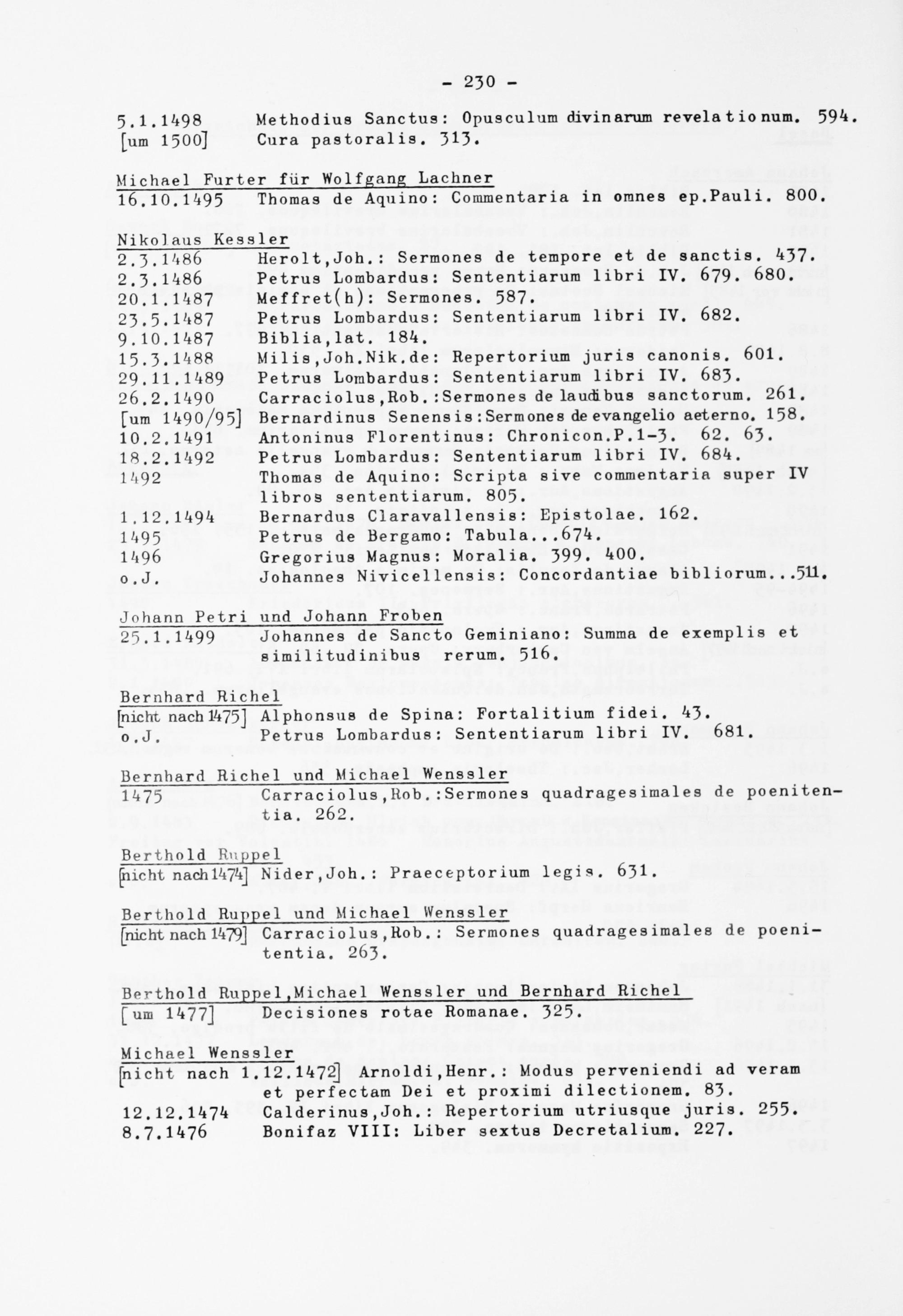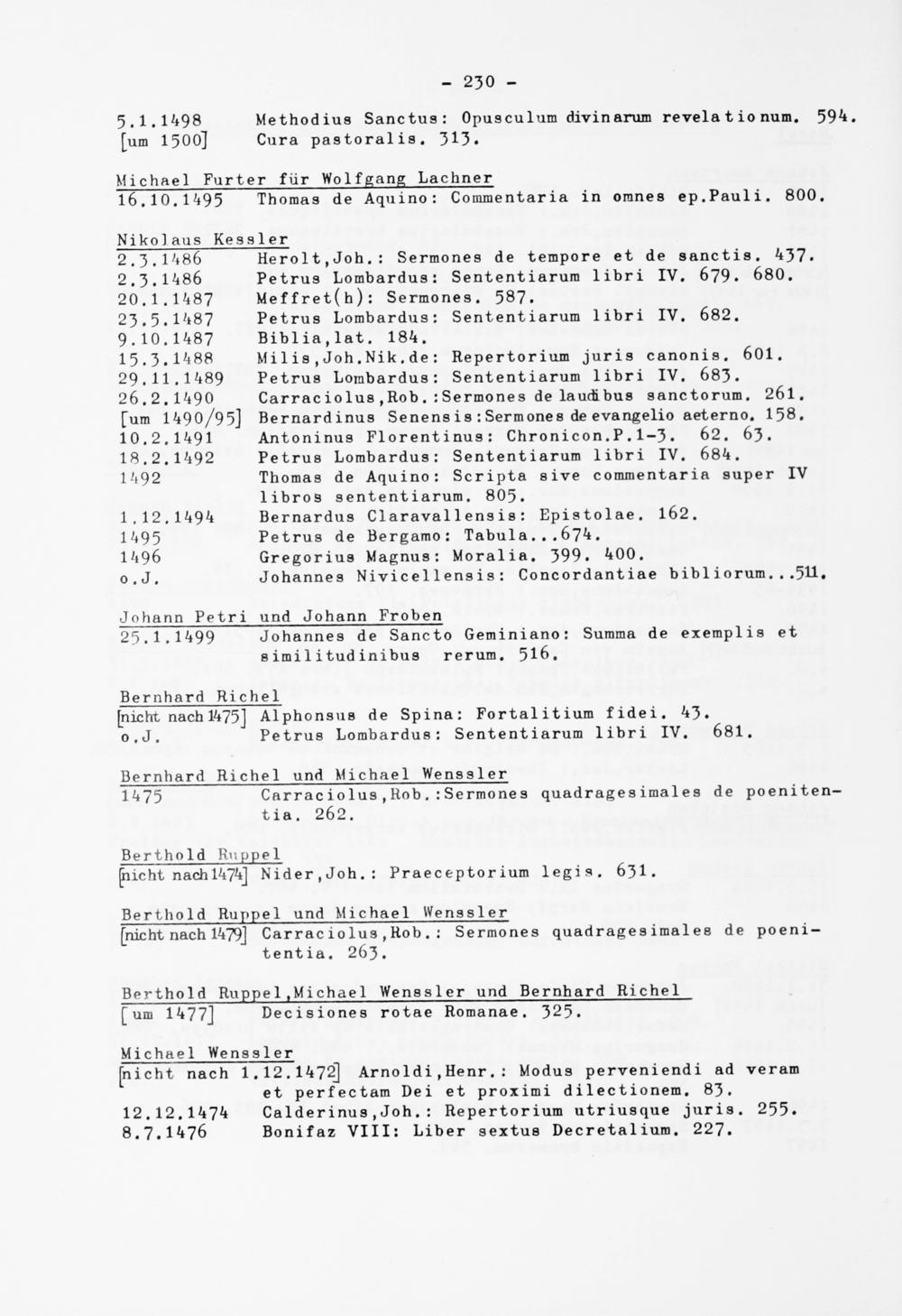 15.3 .1488 Mi 1 ia,Joh.Nik.de: Repertorium juria canonis. 601. 29 .11.1489 Petrus Lombardus: Sententiarum libri IV. 683.