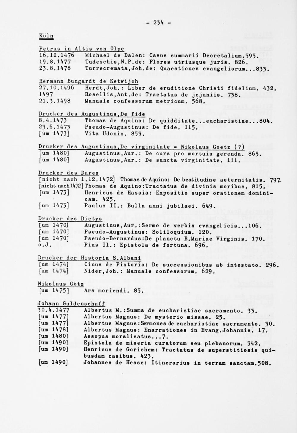 [nicht nach 1.12.1472] Thomas de Aquino: De beatitudine aeternitatis. 797. [nicht nach 1472] Thomas de Aquino :Tractatus de divinis moribus. 815. [um 1473] Henricue de Hassia: Expositio super orationem domini- cam. 425.