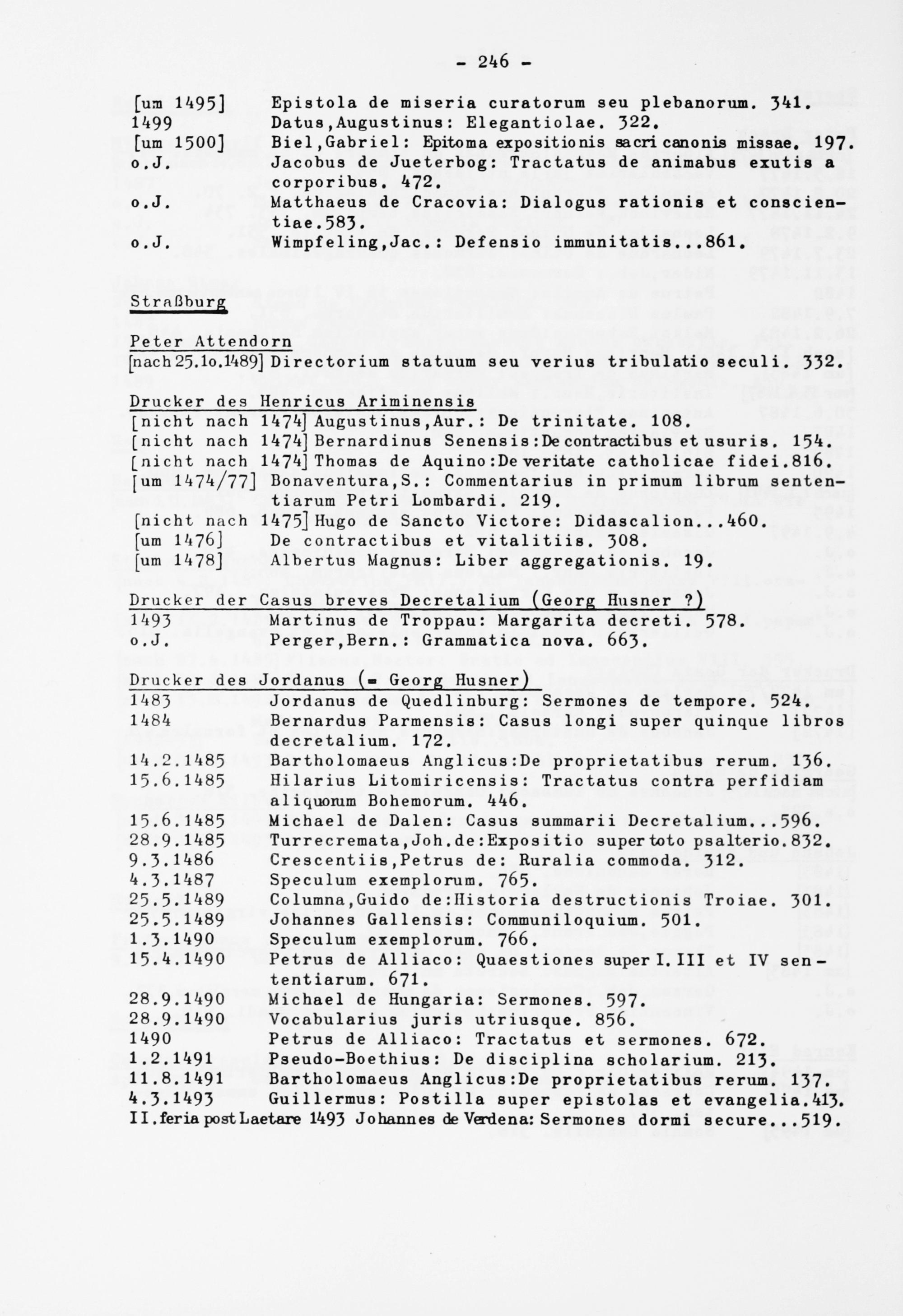 Michael de Hungaria: Sermones. 597. Vocabularius juris utriusque. 856. Petrus de Alliaco: Tractatus et sermones. 672. Pseudo-Boethius: De diseiplina scholarium. 213. Bartho 1 omaeus Anglicus:De proprietatibus rerum. 137. Guillermus: Postilla super epistolas et evangelia. 413. 11 .feria post Laetare 1493 Johannes de Verdena: Sermones dormi secure . . . 519 .