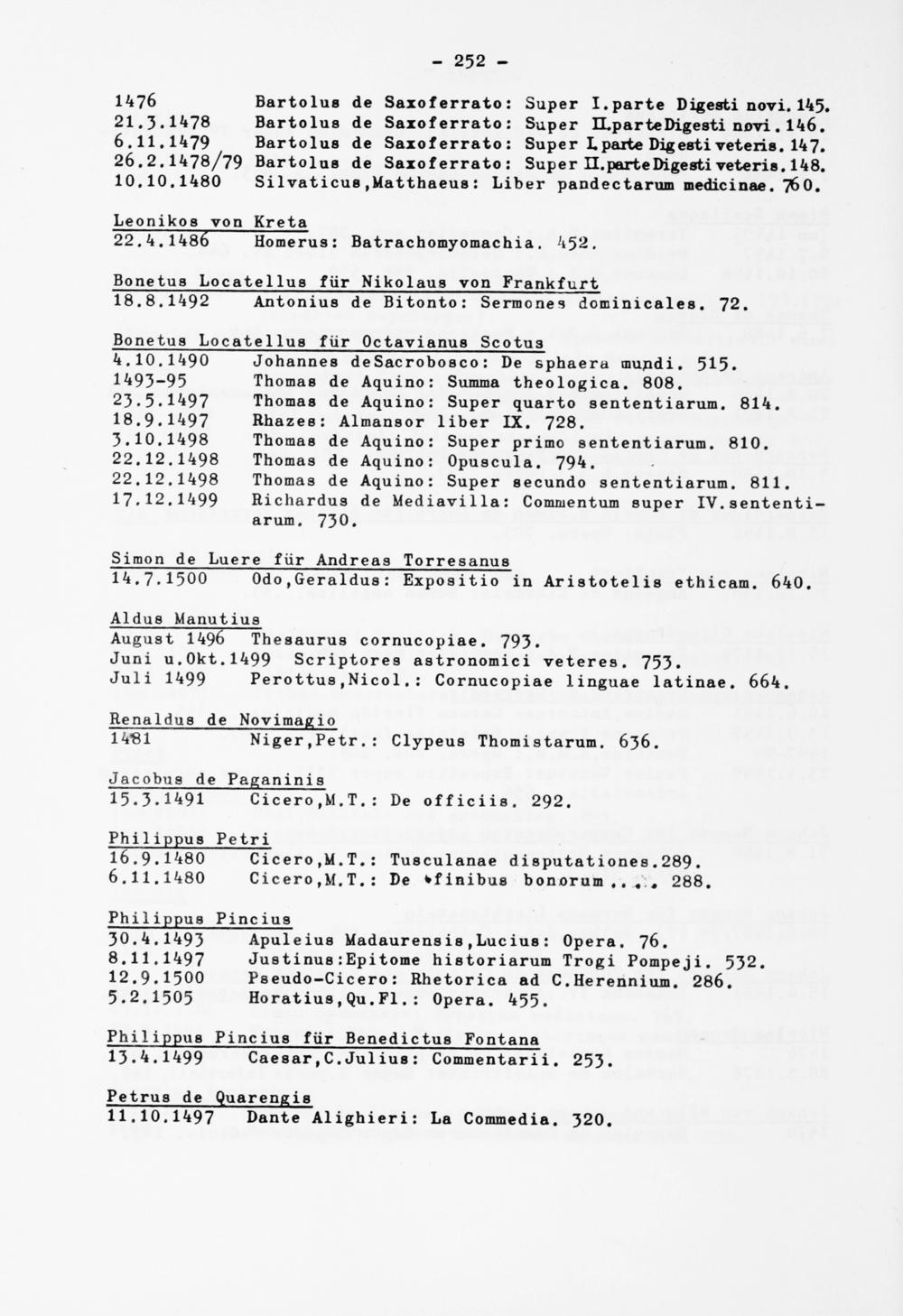 6.11.1479 Bartolus de Saxoferrato: Super L parte Digesti veteris. 147. 26.2.1478/79 Bartolus de Saxoferrato: Super II.parteDigesti veteris. 148. 10.10,1480 Silvaticus.Matthaeus: Liber pandectarum medicinae. 760.