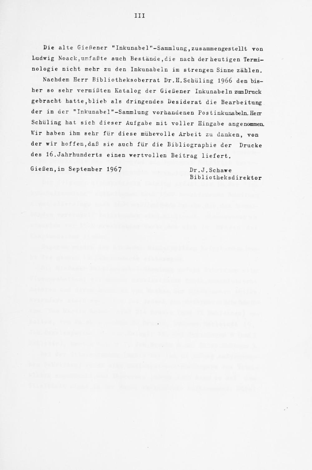 Nachdem Herr Bibliotheksoberrat Dr. H. Schiil ing I966 den bisher so sehr vermißten Katalog der Gießener InkunabeIn zumDruck gebracht hatte,blieb als dringendes Desiderat die Bearbeitung der in der " Inkunabe 1 "-Sammlung vorhandenen Postinkunabeln.Herr Schilling hat sieb dieser Aufgabe mit voller Hingabe angenommen. Vi 'ir haben ihm sehr für diese mühevolle Arbeit zu danken, von der wir hoffen,daß sie auch für die Bibliographie der Drucke des 16 .Jahrhunderts einen wertvollen Beitrag liefert.