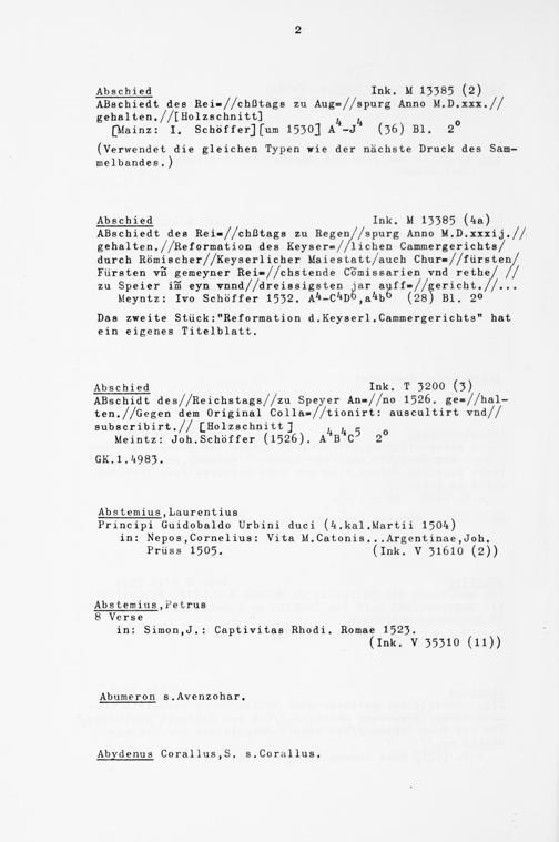 durch Römischer//Keyserlicher Maiestatt/auch Chur-//fürsten/ Fürsten vn gemeyner Rei»//chstende Comissarien vnd rethe/ // zu Speier im eyn vnnd//dreissigsten iar auff-//gericht.//... Meyntz: Ivo Schöffer 1532. A^-C^, aH 6 (28) Bl. 2°