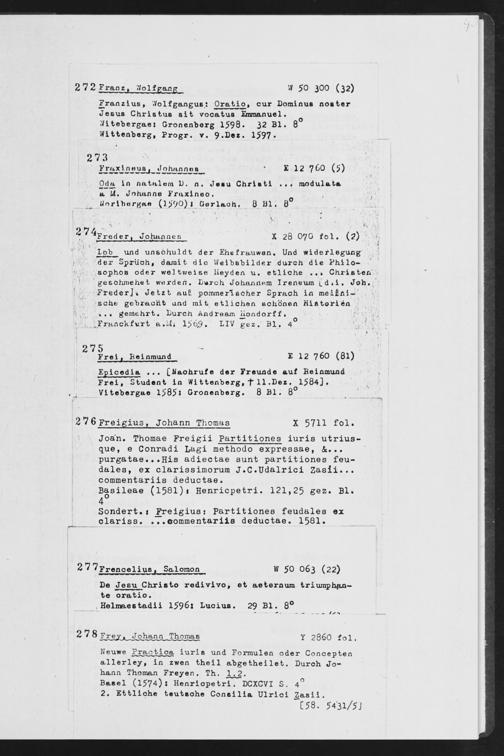 Franzius, .Volf gangu6.: Oratio , cur Dominus noster JesuB Christus sit vocatus Emmanuel. Wltebergae: Gronenberg 1598. 32 Bl. 8 Wittenberg, Progr. v. 9. Der. 1597-