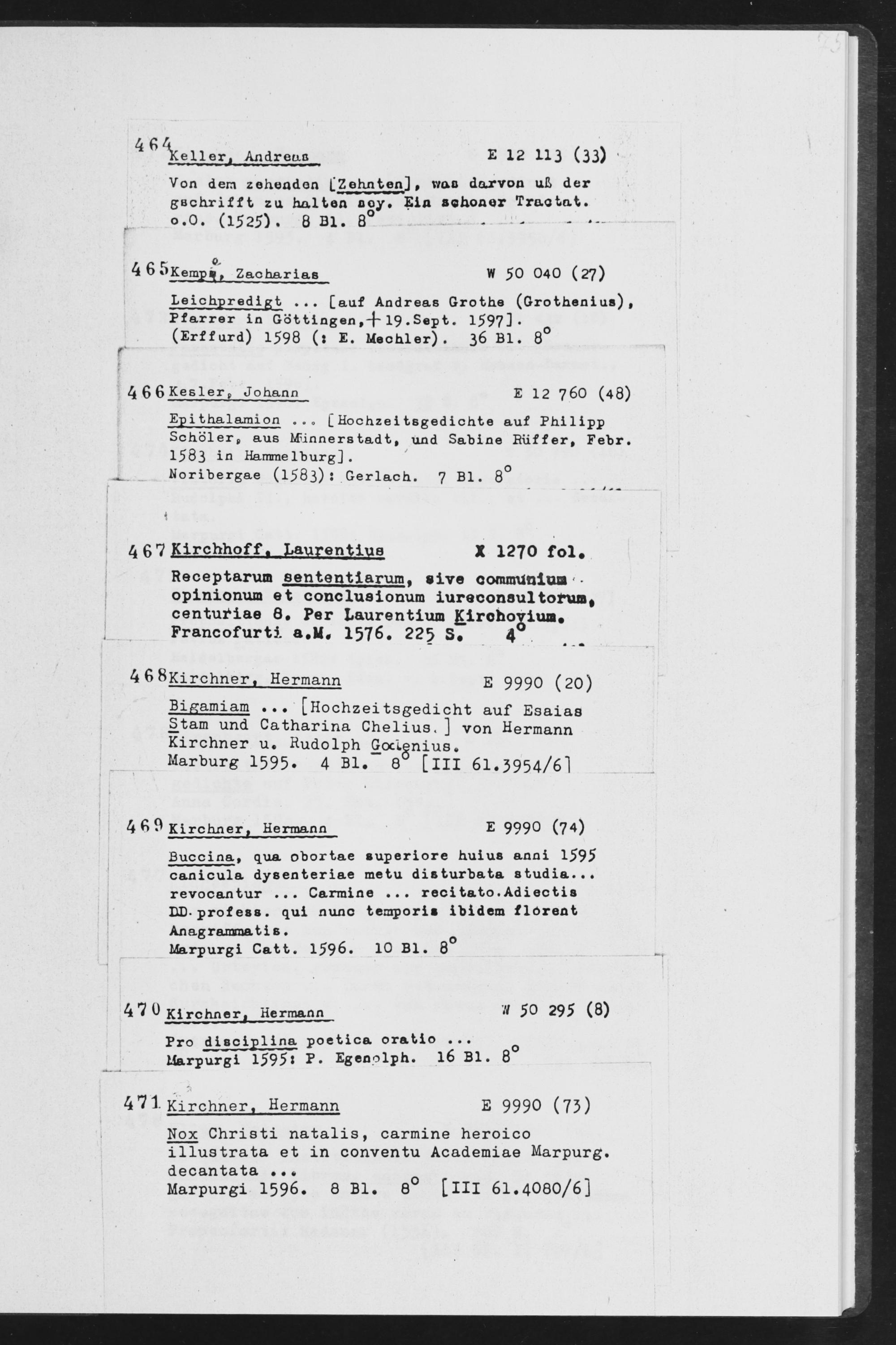 Bigamiam ... [Hochzeitsgedicht auf Esaias Stam und Catharina Chelius.] von Hermann Kirchner u. Rudolph Goc'ienius. Marburg 1595. 4 Bl. 6 Ö [III 61.3954/6]