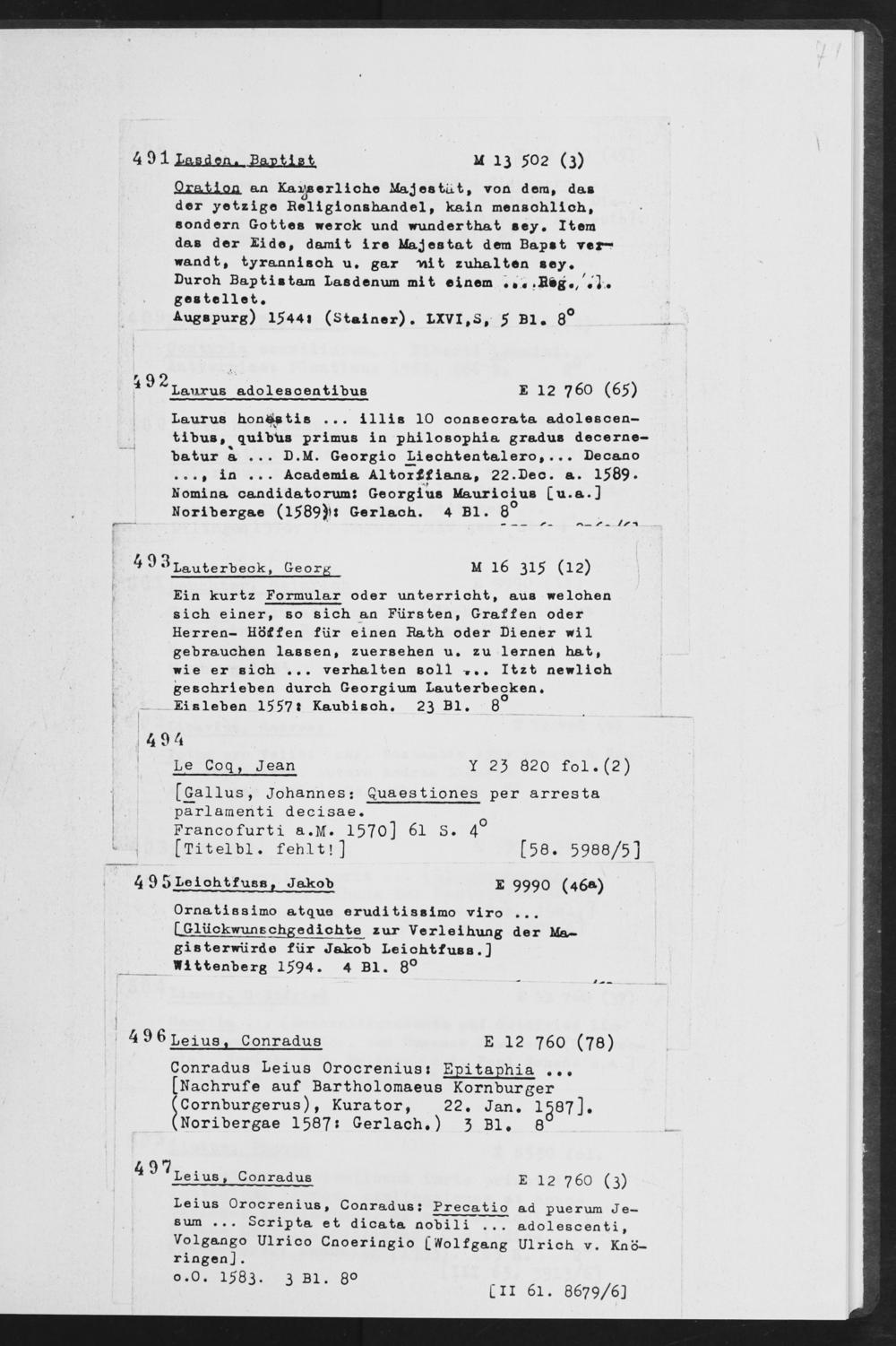 Laurus honö«tis ... illis 10 oonseorata adolescen— tibus, quibus primus in philosophia gradus decerne- batur a ... D.M. Georgio I-iechtentalero, ... Decano in ... Academia Altorffiana, 22 .Dec. a. 1589* Nomina candidatorum: Georgius Maurioius [u.a.] Norlbergae (l589 )tt Gerlach. 4 Bl. 8°