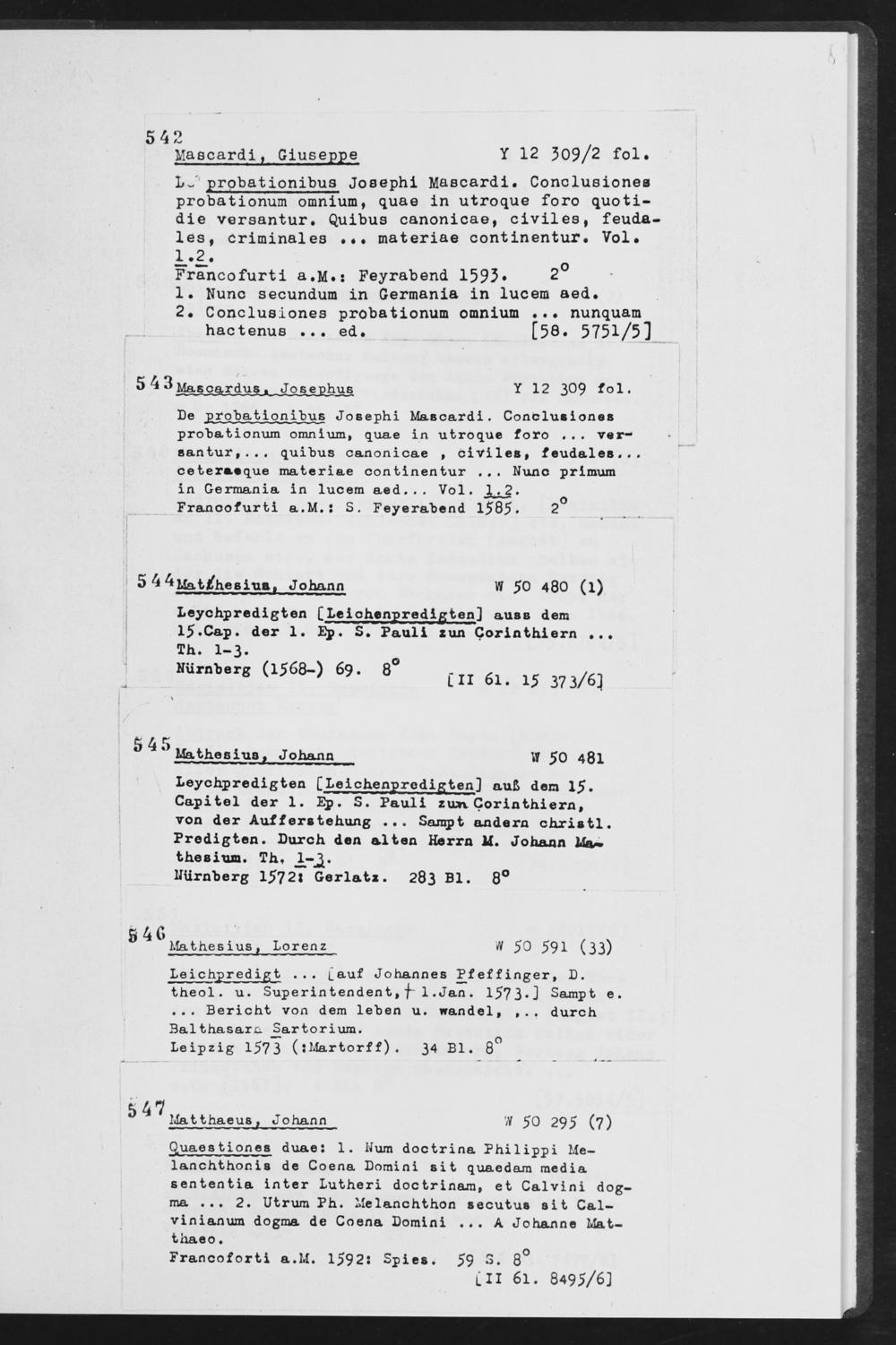 L- prpbationibus Josephi Mascardi. Conclusiones probationum omnium, quae in utroque foro quoti- die versantur. Quibus canonicae, civiles, feuda. les, criminales ... materiae continentur. Vol. 1.2. o Francofurti a.M.: Feyrabend 1593» 2